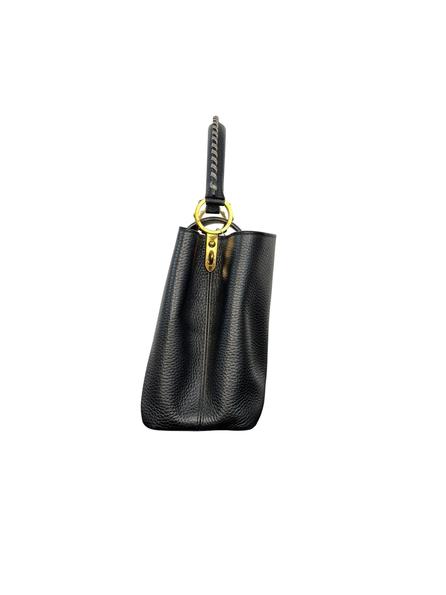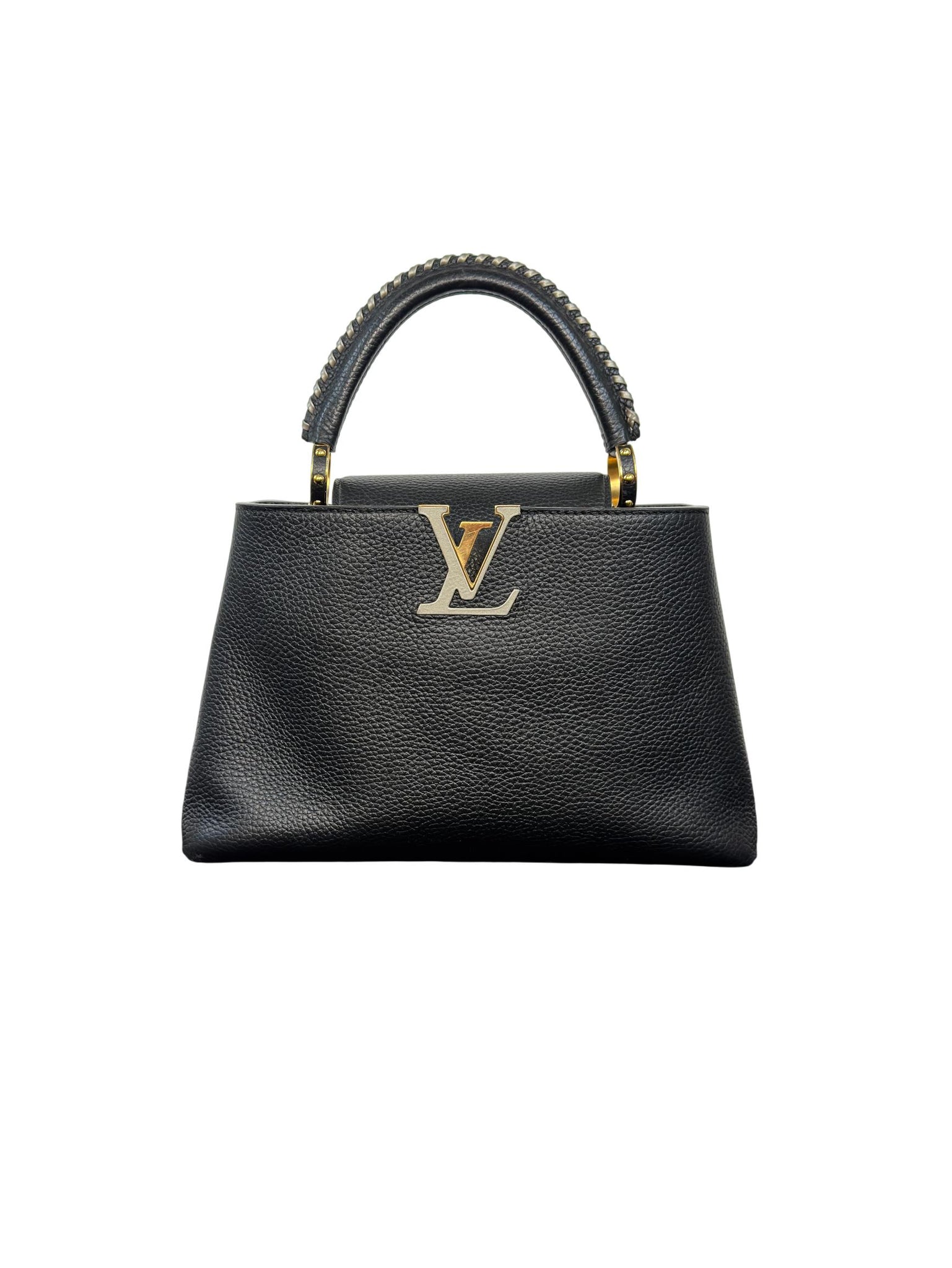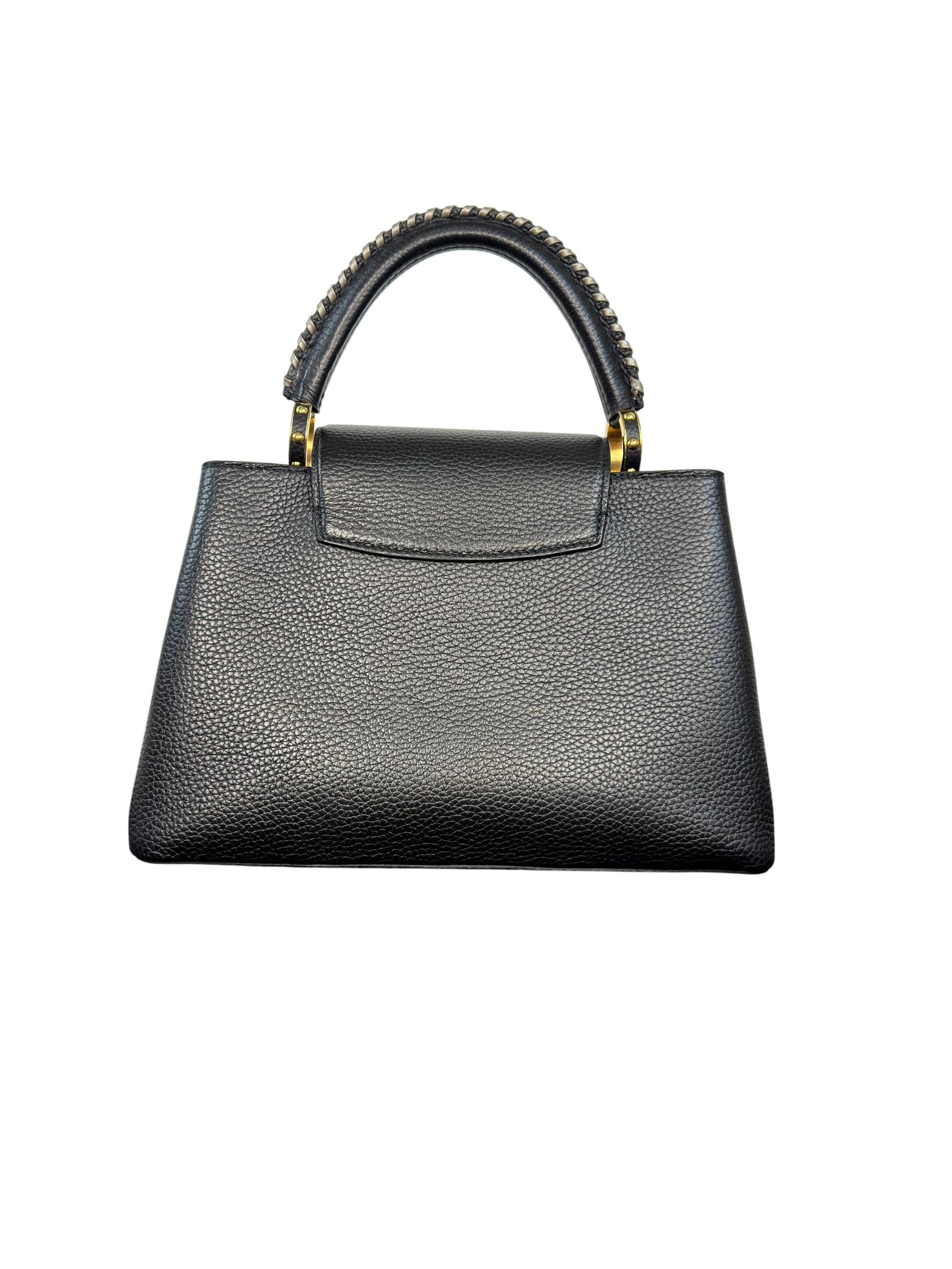 Louis Vuitton Capucines MM  in Black Taurillon Leather with Gold Hardware is a luxury handbag featuring elegant gold rings and a distinctive grey braided handle. Crafted from premium Taurillon leather, this designer handbag combines sophisticated style with durable construction, making it perfect for fashion-forward individuals seeking both form and function.