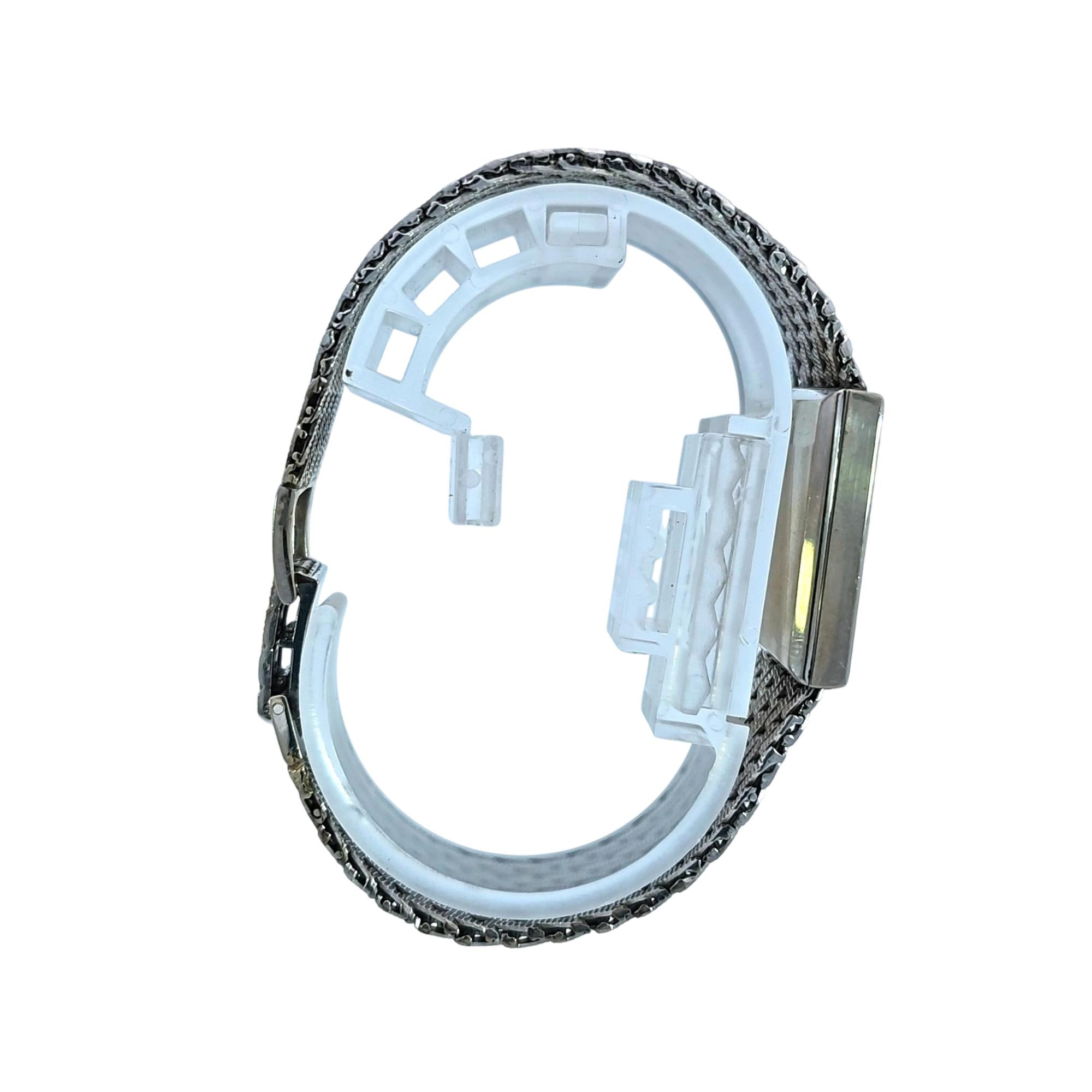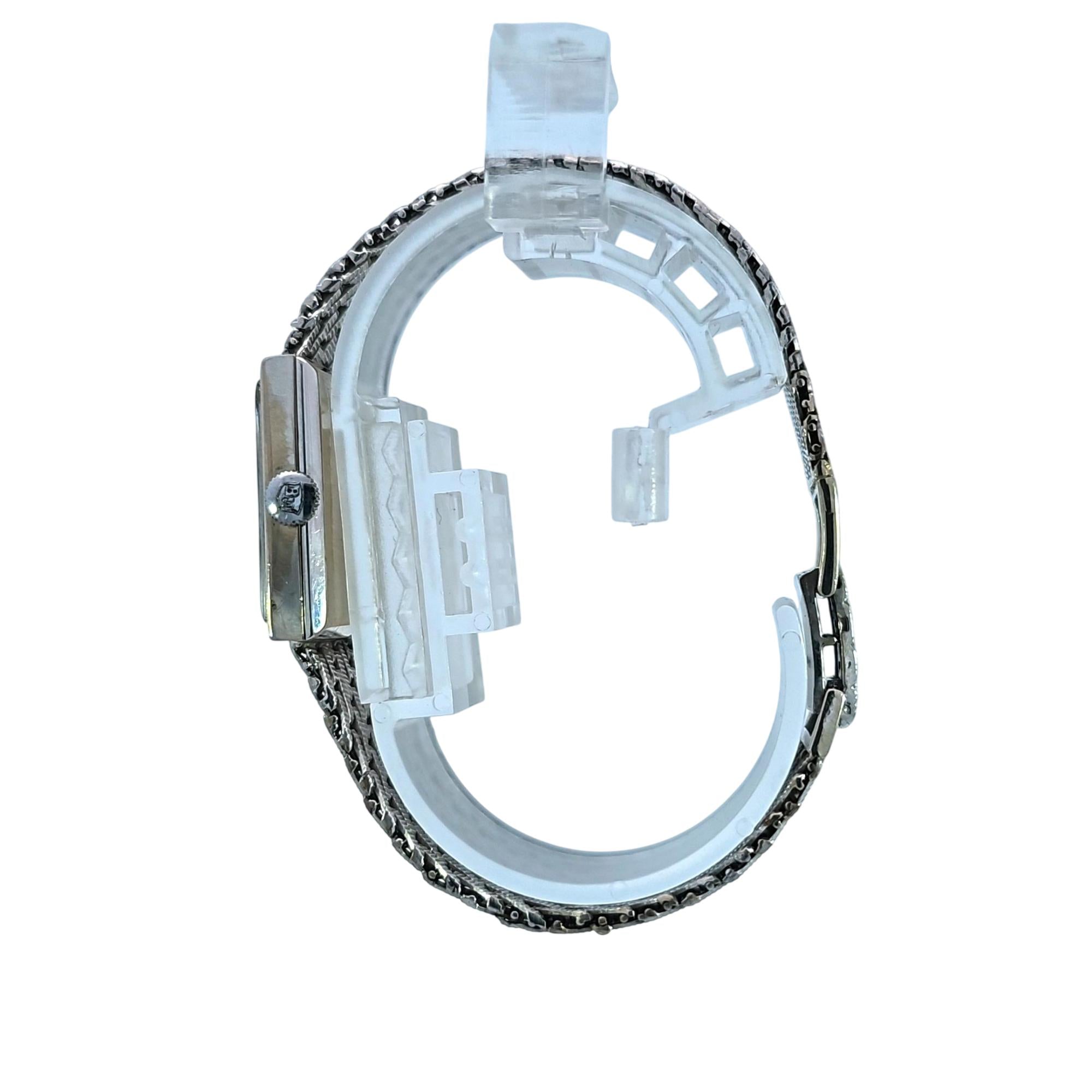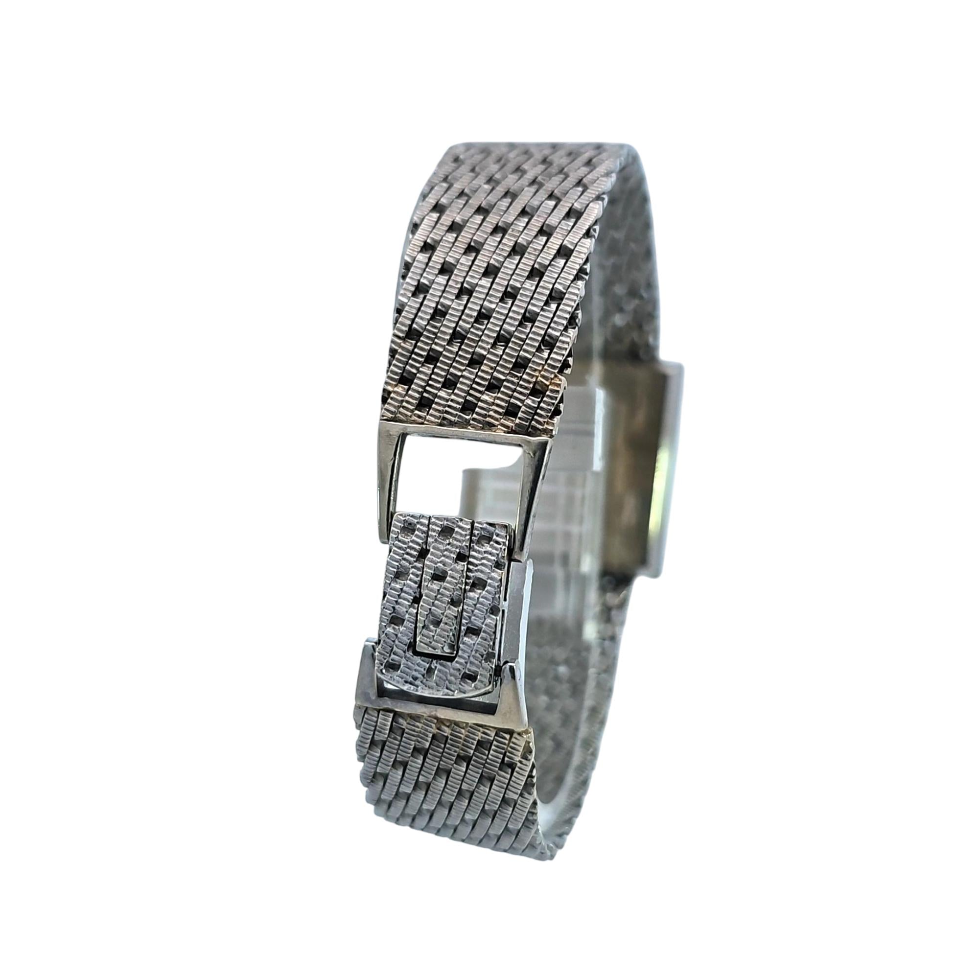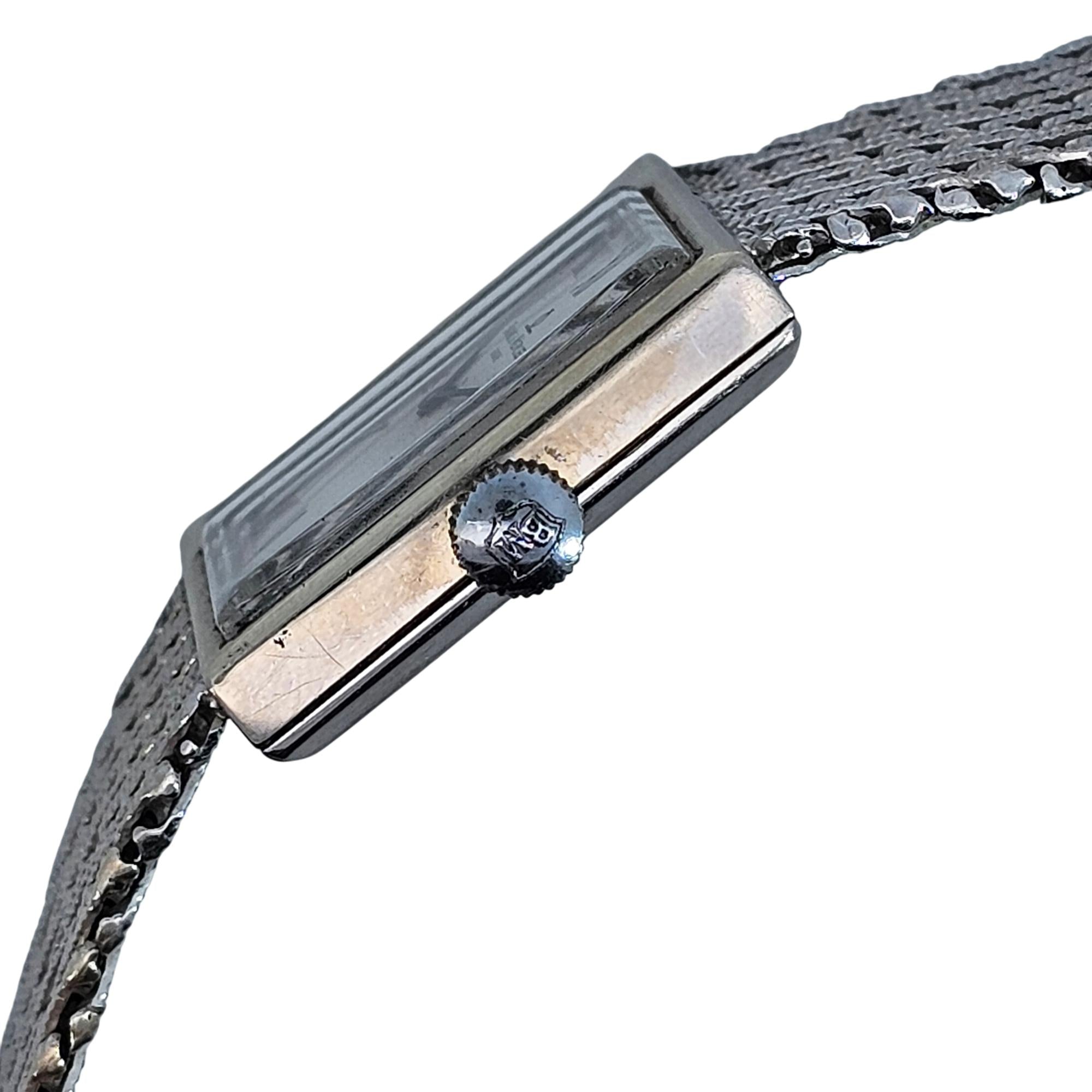 Baume & Mercier 14K White Gold Rectangle Vintage Watch, Geneve is an elegant analog timepiece featuring a silver rectangle dial with classic Roman numerals. Crafted from 14 karat white gold, this vintage watch combines timeless design with luxurious materials, making it a sophisticated fashion accessory for collectors and enthusiasts.