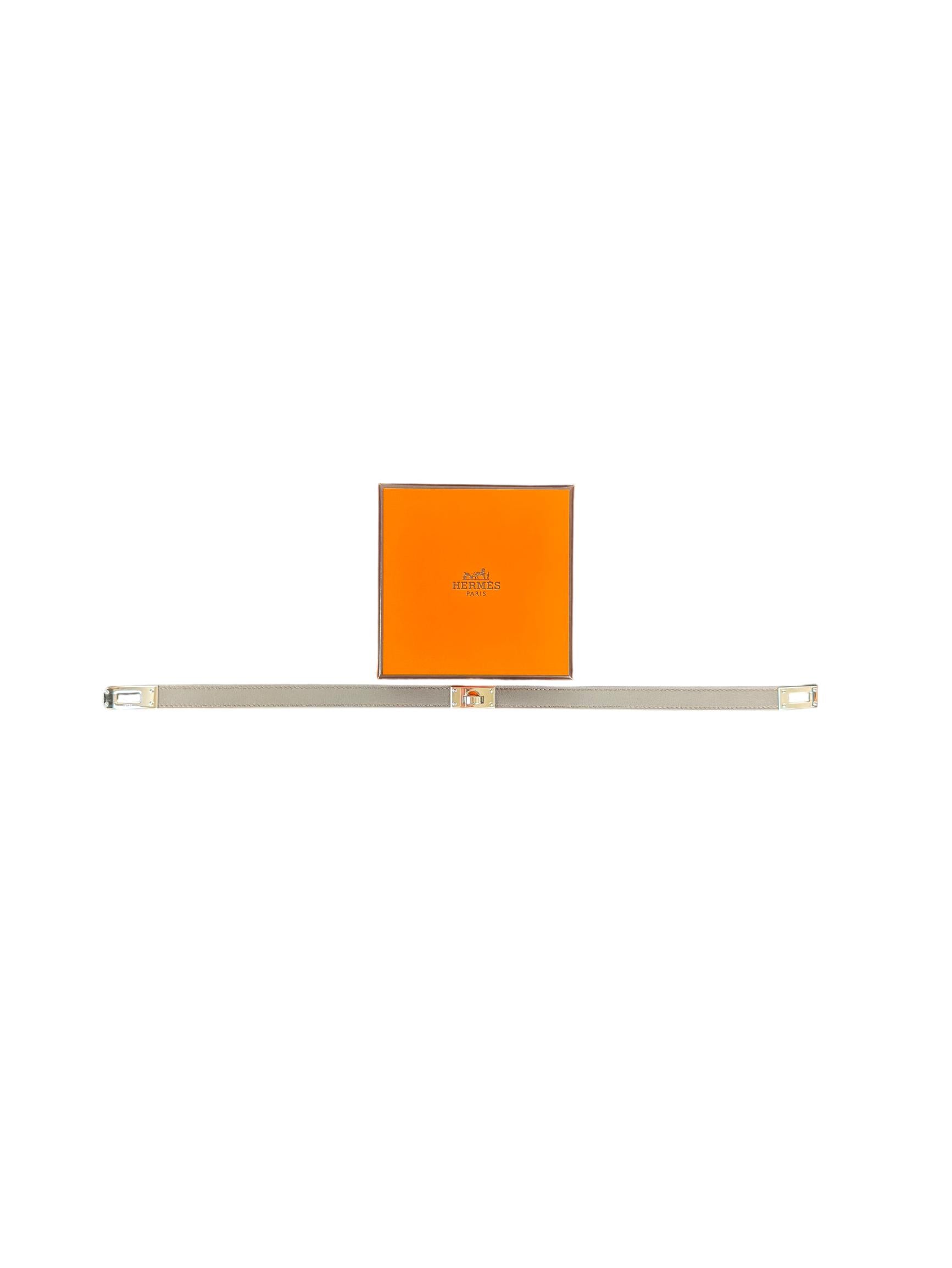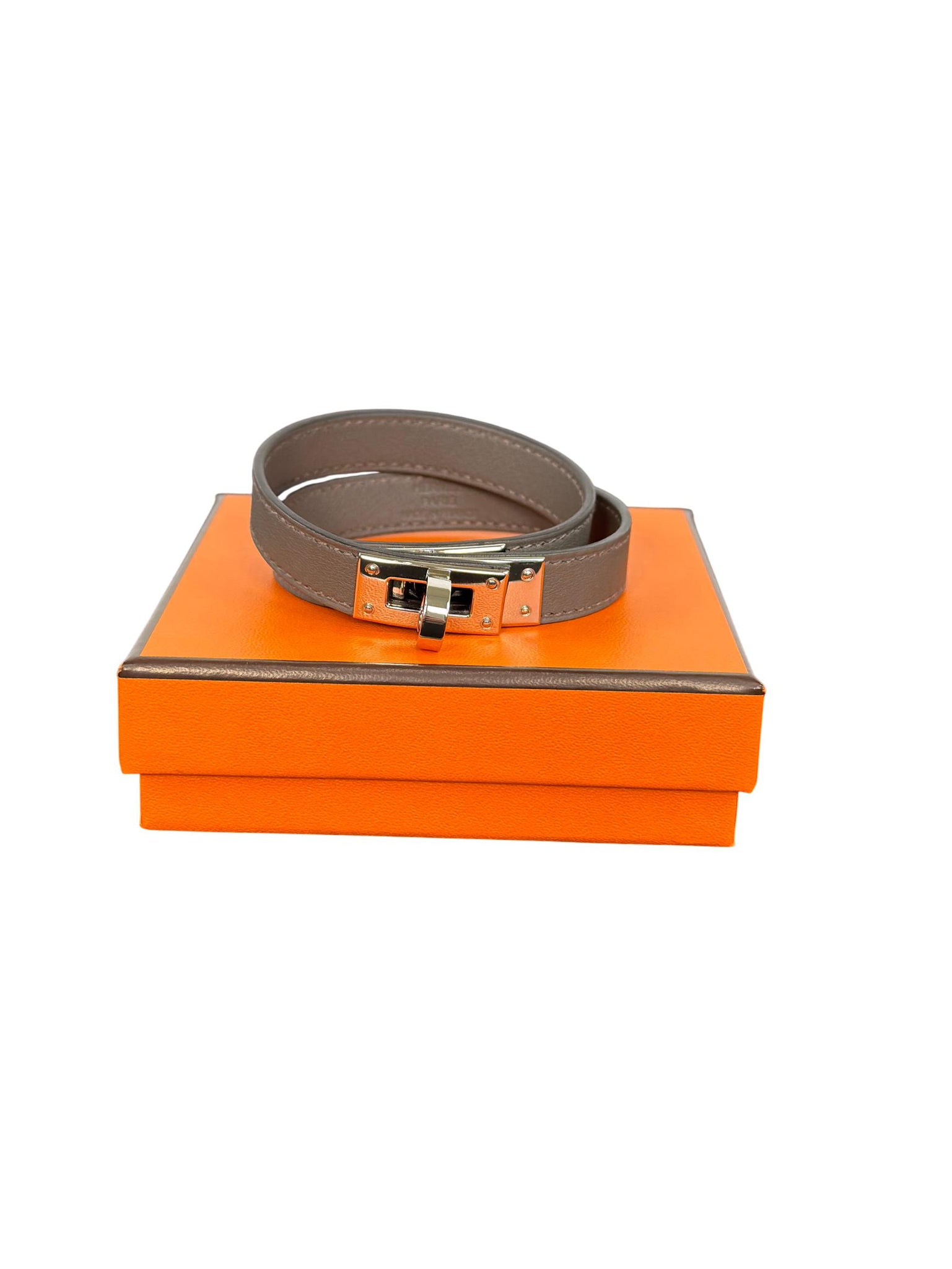 Hermès Kelly Double Tour Leather Bracelet, Taupe with Palladium Hardware is a luxurious leather accessory featuring premium taupe leather wrapped twice around the wrist with elegant palladium hardware. Crafted in France, this iconic bracelet combines timeless style and exquisite craftsmanship, perfect for elevating any outfit. Ideal for collectors and fashion enthusiasts seeking authentic Hermès leather goods.