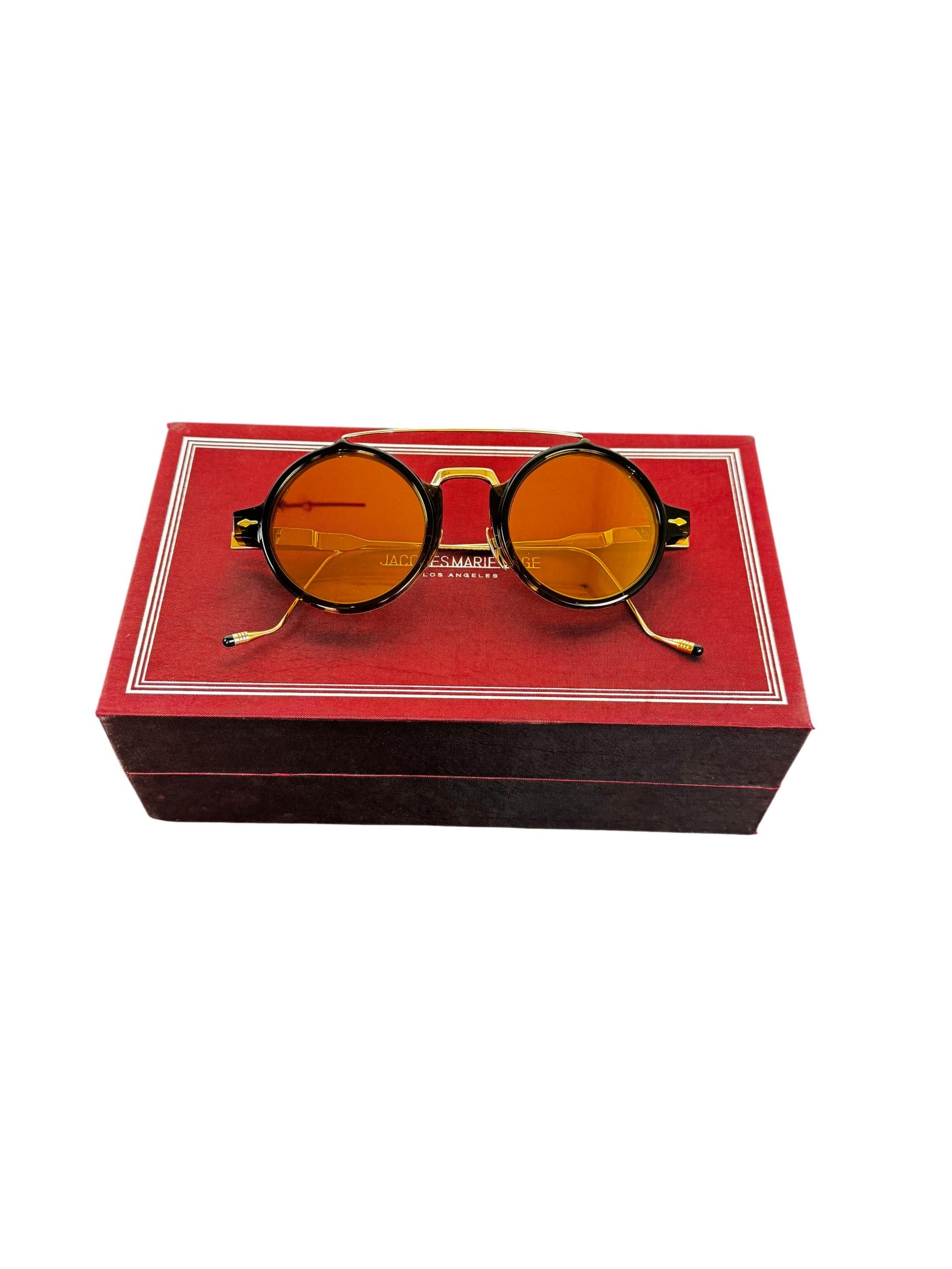 Jacques Marie Mage Eluard Round Sunglasses feature a classic 47mm round frame crafted from high-quality acetate combined with gold-tone metal accents for a luxurious finish. These designer sunglasses are distinguished by their unique blend of vintage style and modern craftsmanship, perfect for fashion-forward individuals seeking premium eyewear.