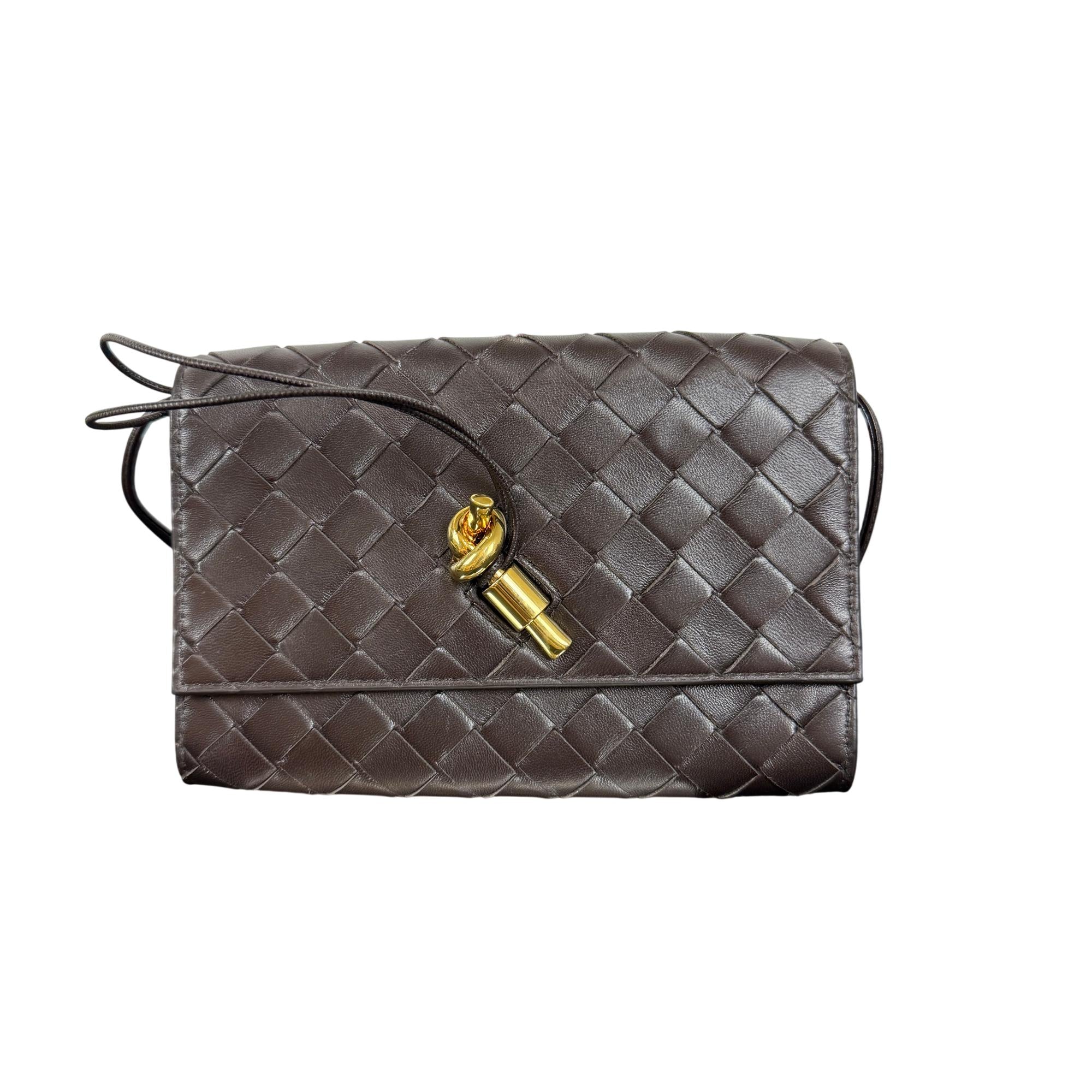 Bottega Veneta Andiamo Intrecciato Leather Pouch Bag - Brown, Crossbody/Shoulder Strap features a finely crafted brown leather design with the signature intrecciato weave. This versatile handbag includes a practical shoulder strap and gold hardware, making it an elegant accessory for everyday carry and special occasions.
