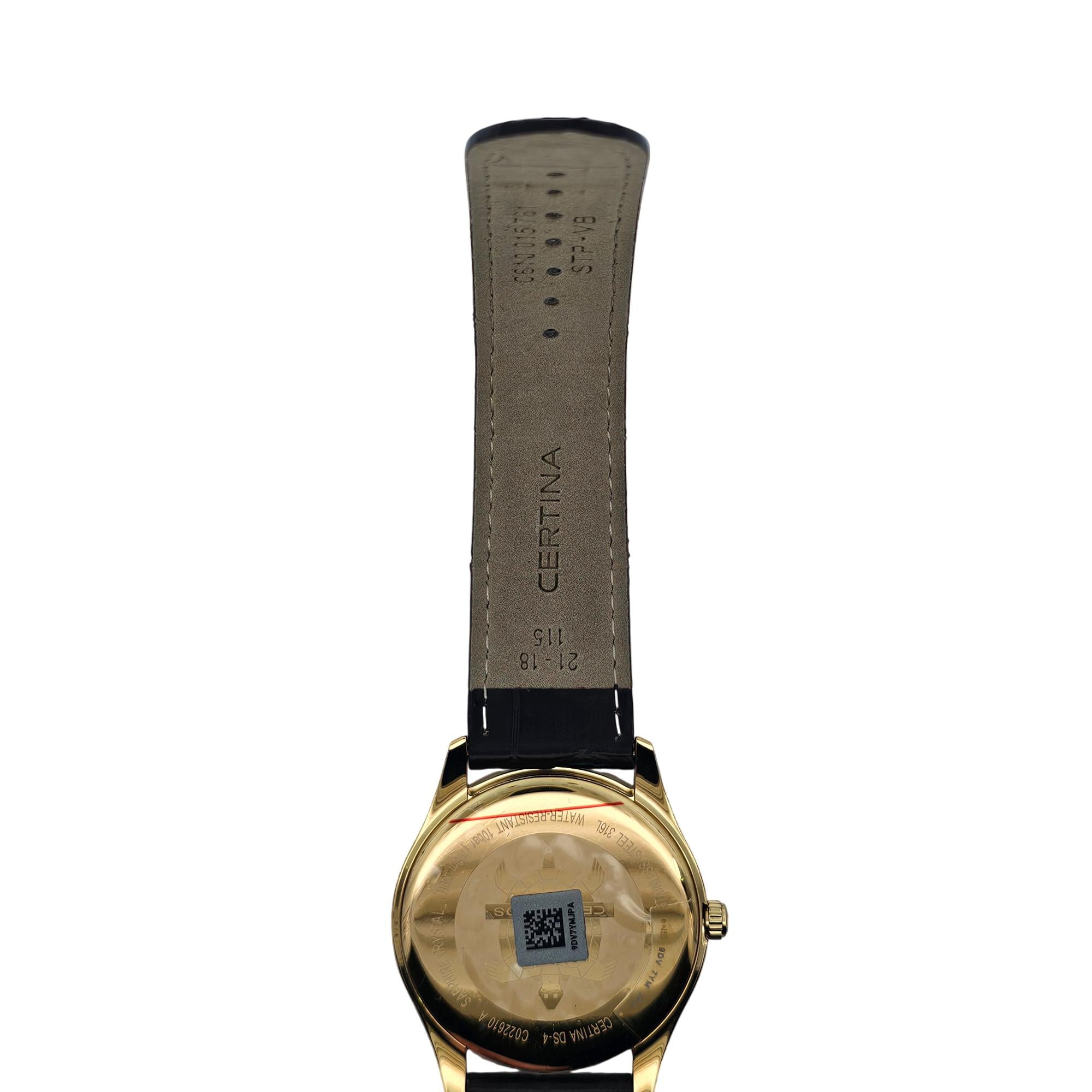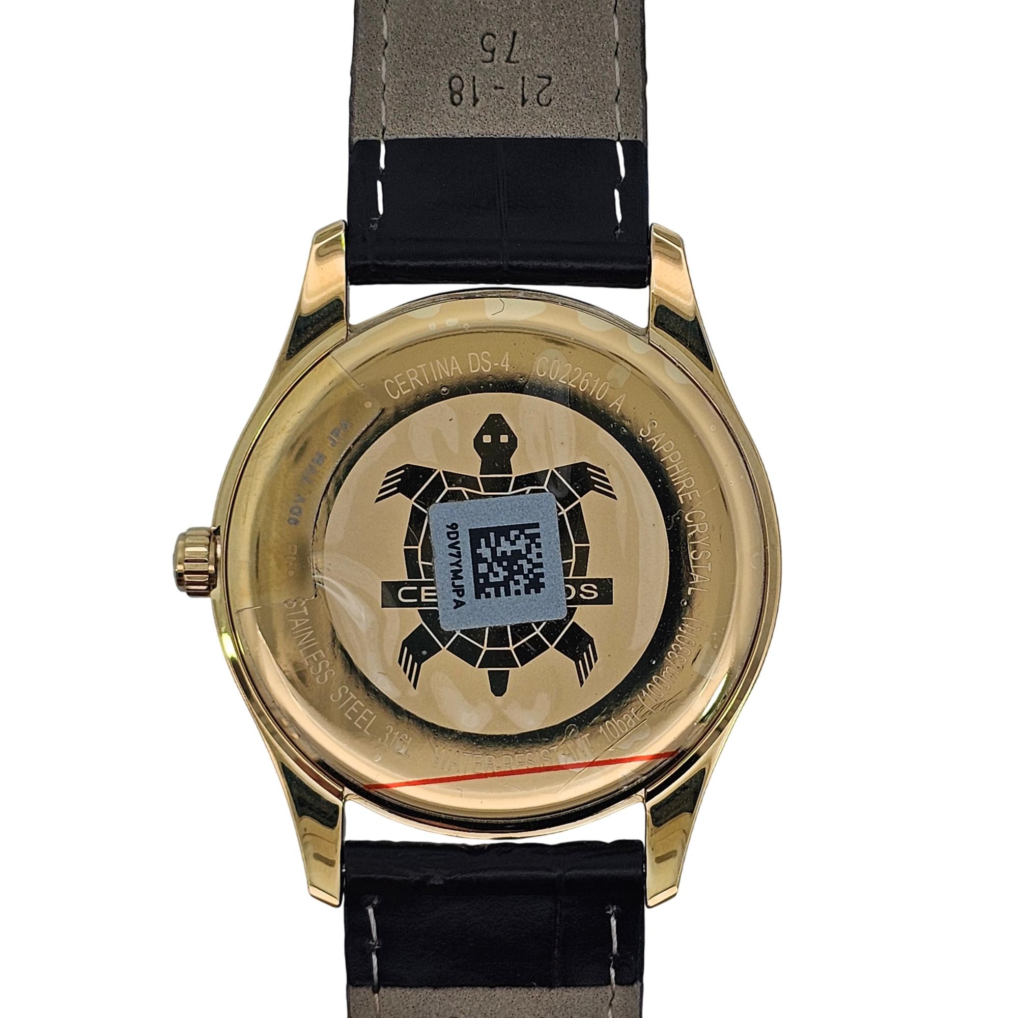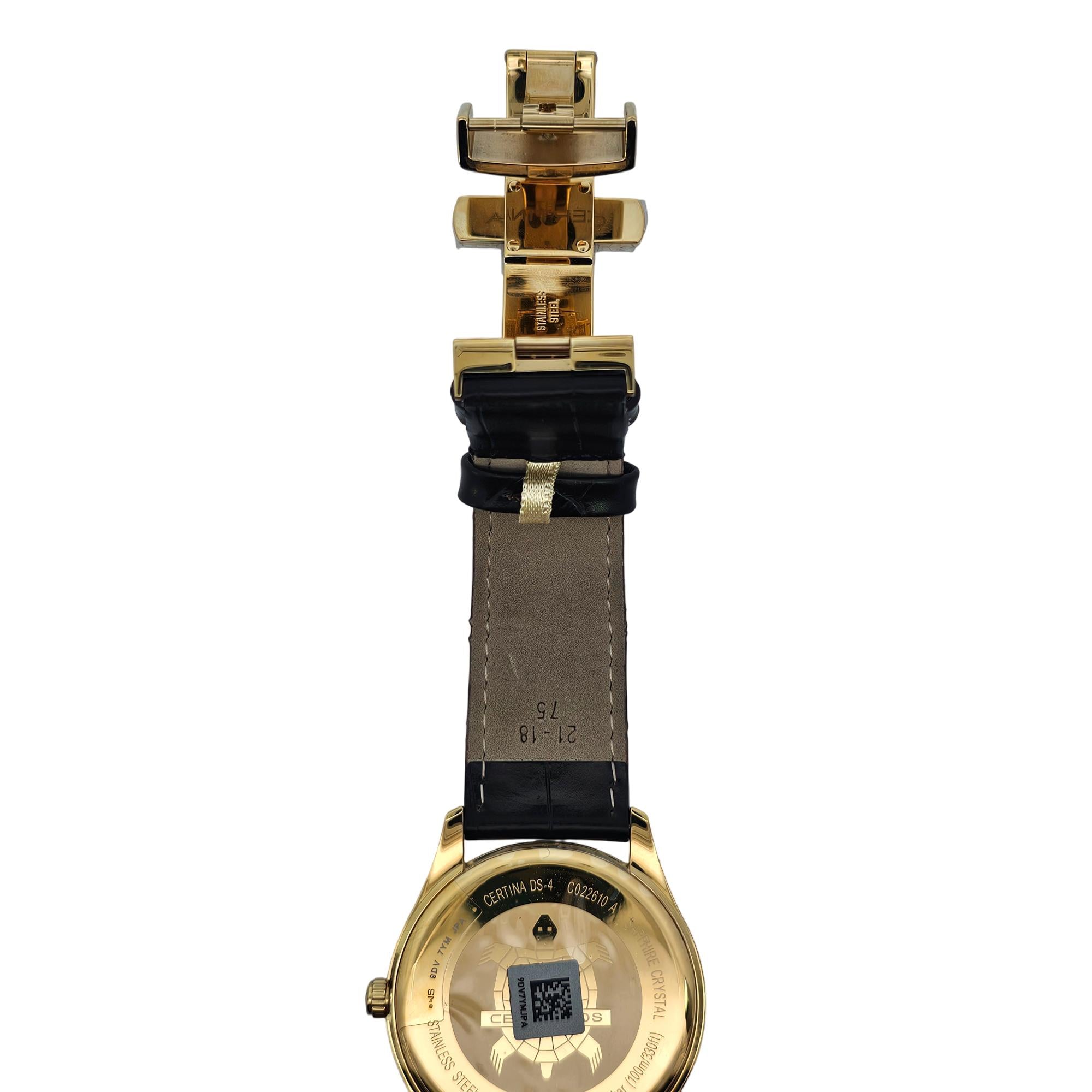 Certina DS-4 1888 Quartz Men's Watch (Model C0226101603101) Gold Case, Leather Strap features a Swiss-made precision quartz movement housed in a sleek gold case with a sophisticated brown leather strap. This elegant 40mm analog watch combines classic design with durable materials, perfect for everyday wear and fashion-conscious individuals seeking a reliable accessory.