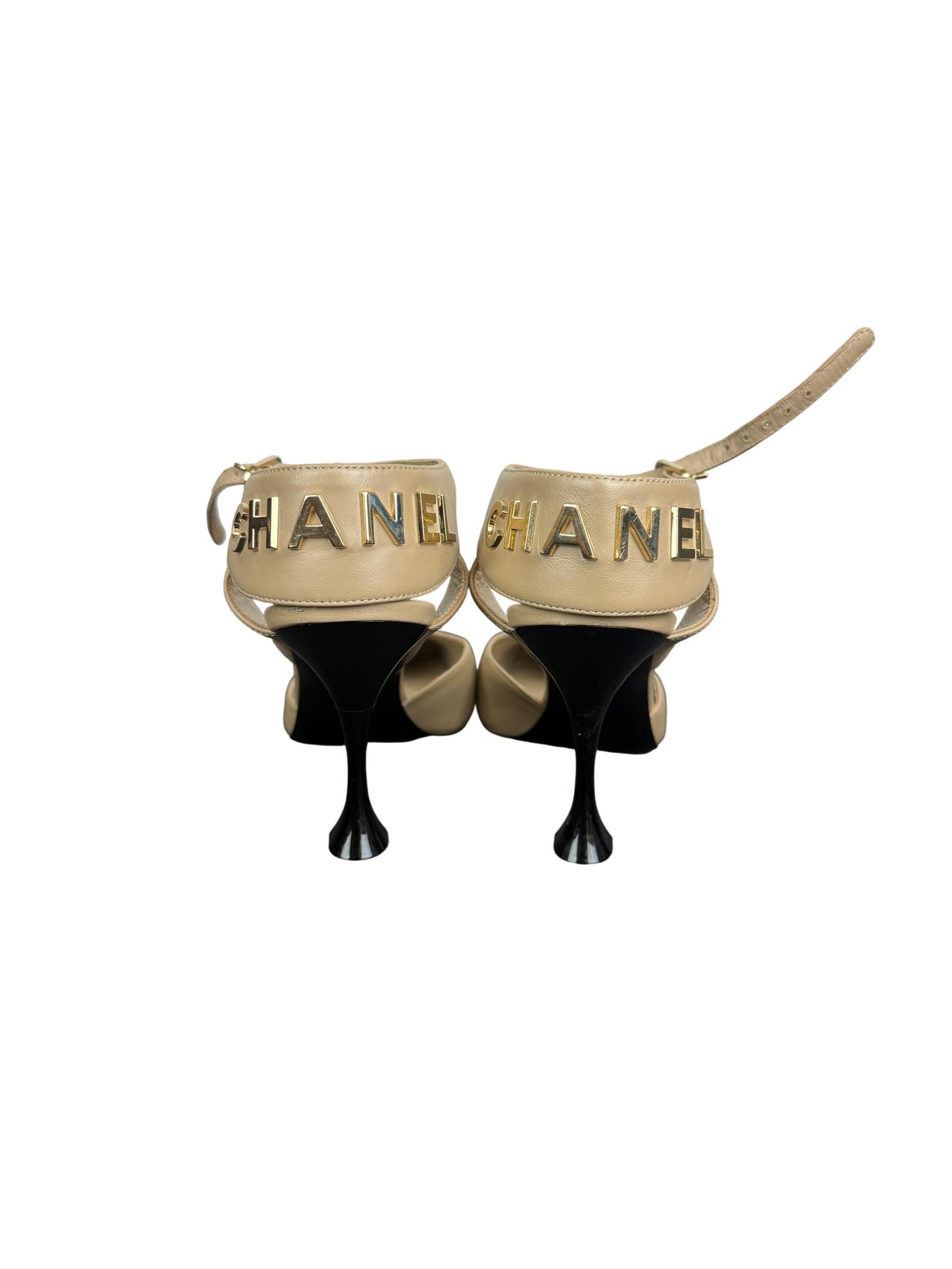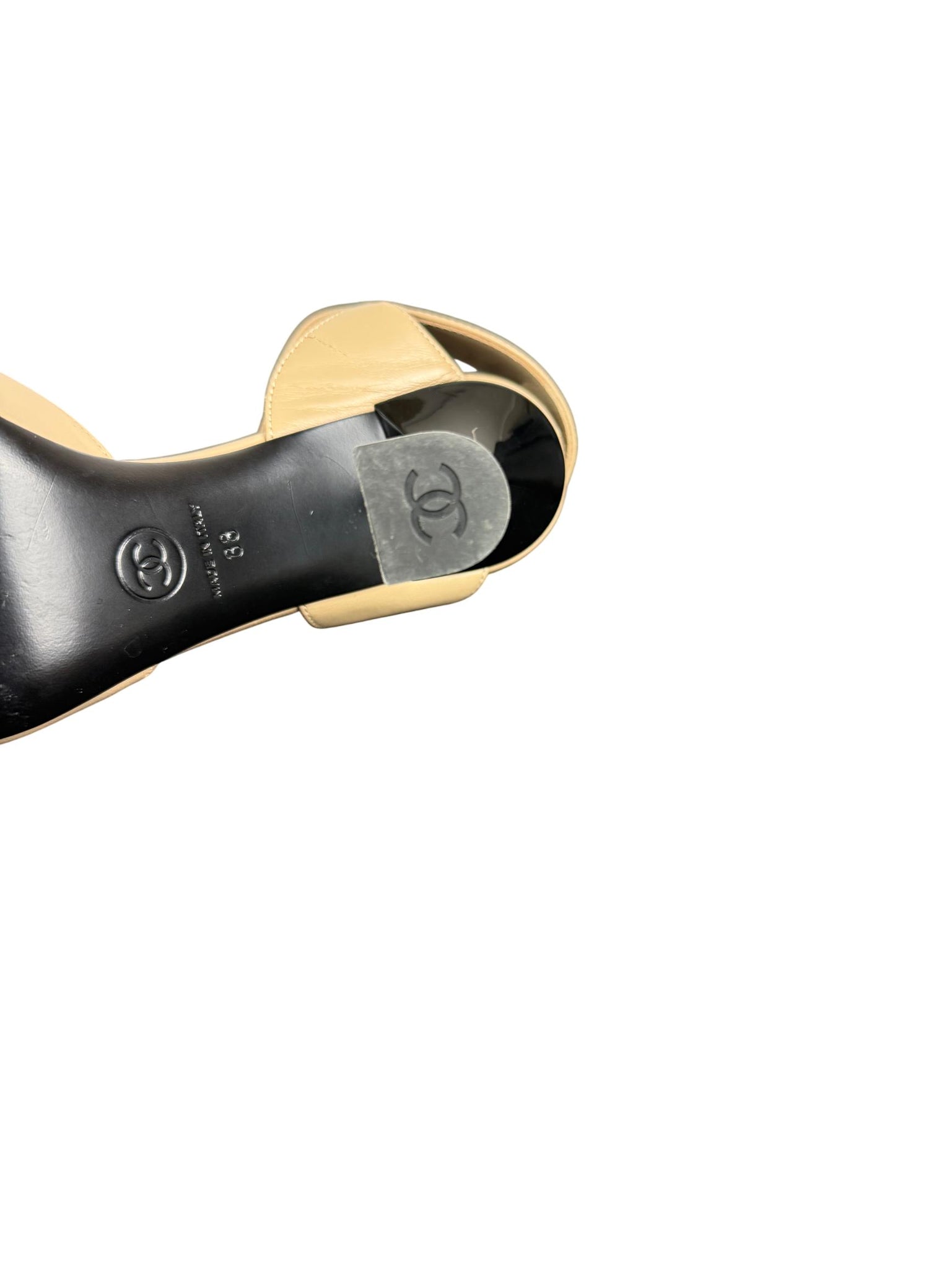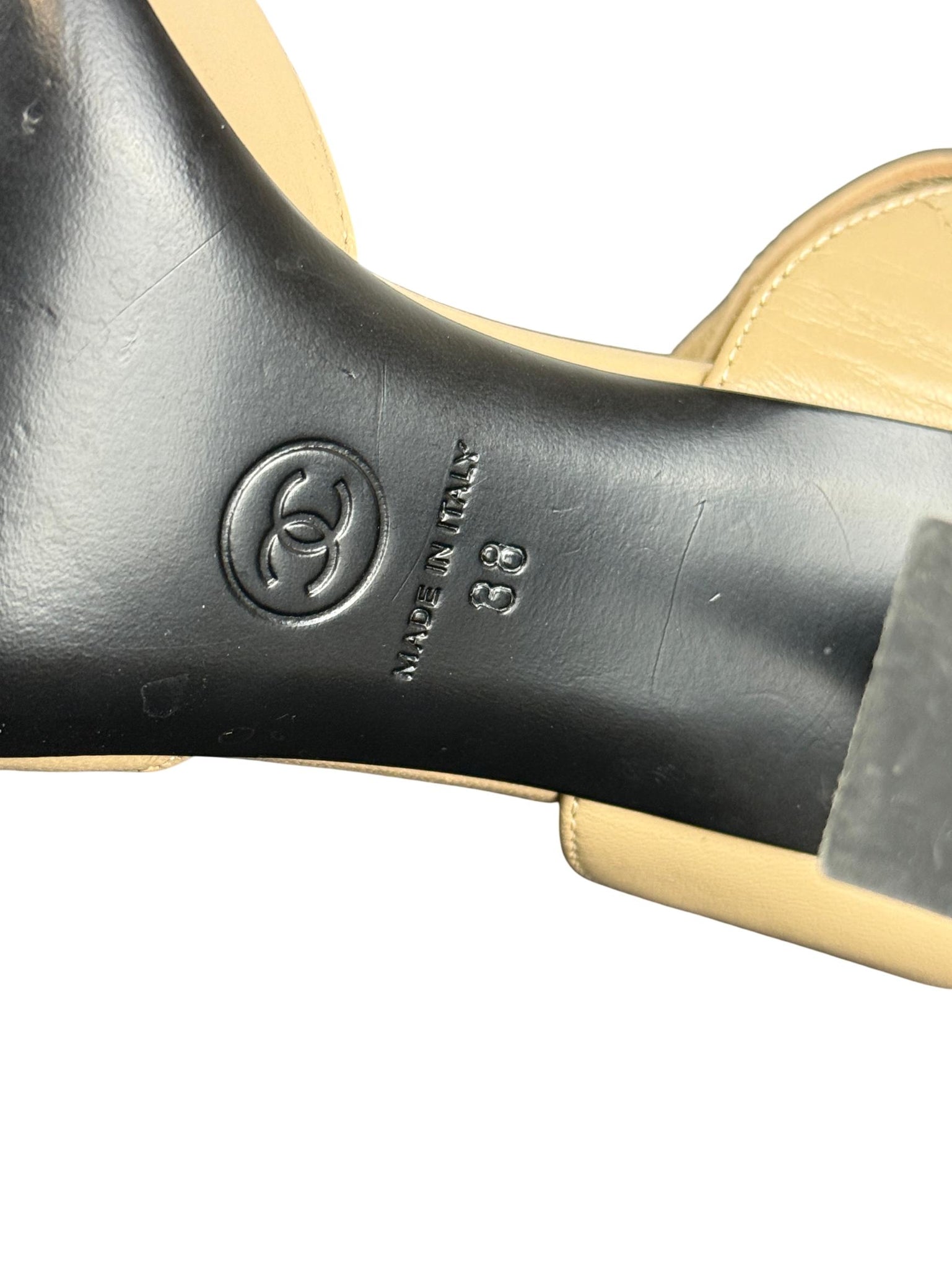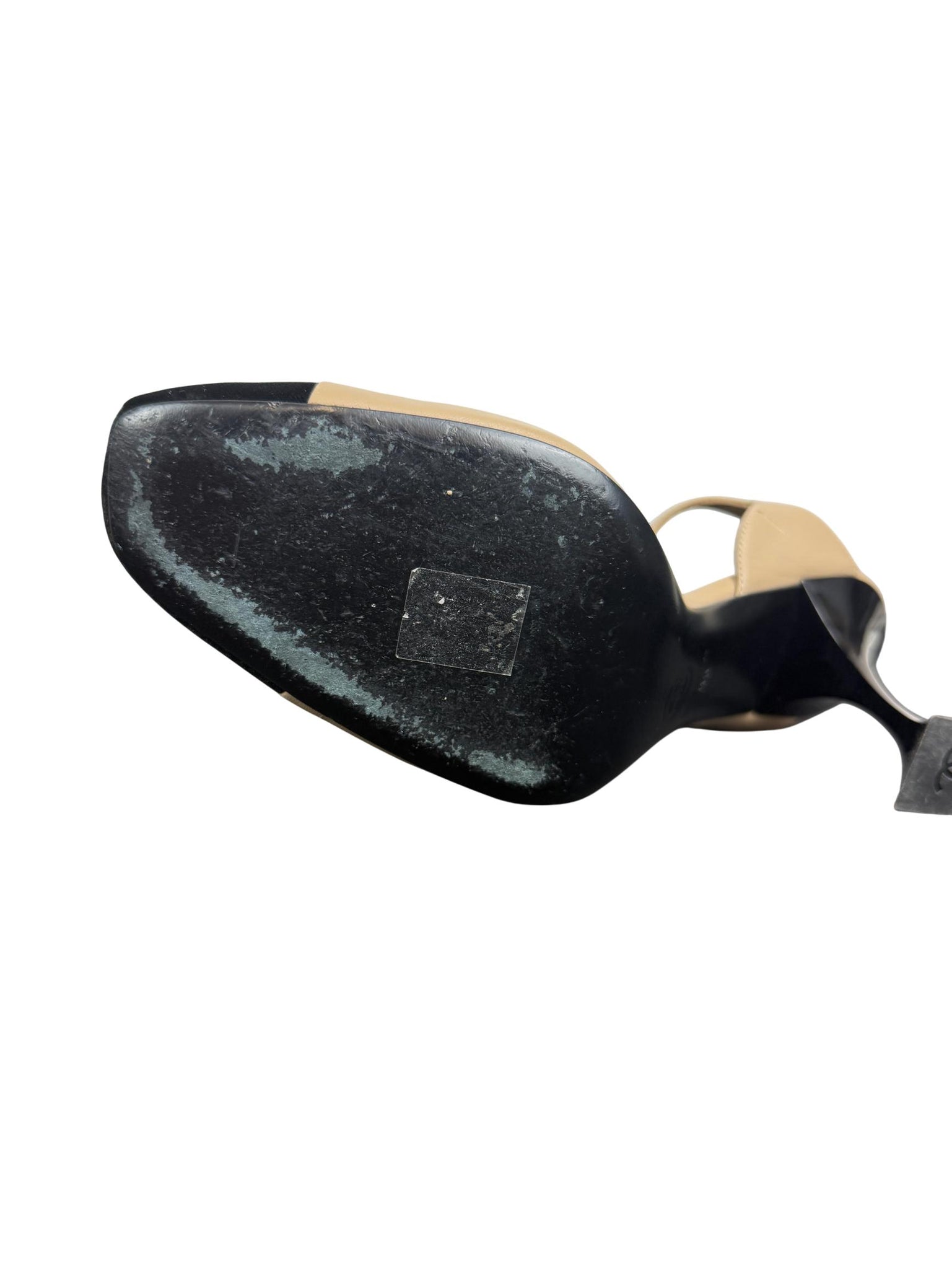 Chanel Beige & Black Leather Cap-Toe Slingback Heels feature elegant beige leather with classic black cap-toe detailing, crafted from premium materials for a sophisticated look. These high-heeled slingbacks combine timeless design and luxurious comfort, making them a perfect addition to any fashion-forward wardrobe. Ideal for special occasions or upscale everyday wear, these Chanel heels embody iconic style and quality.