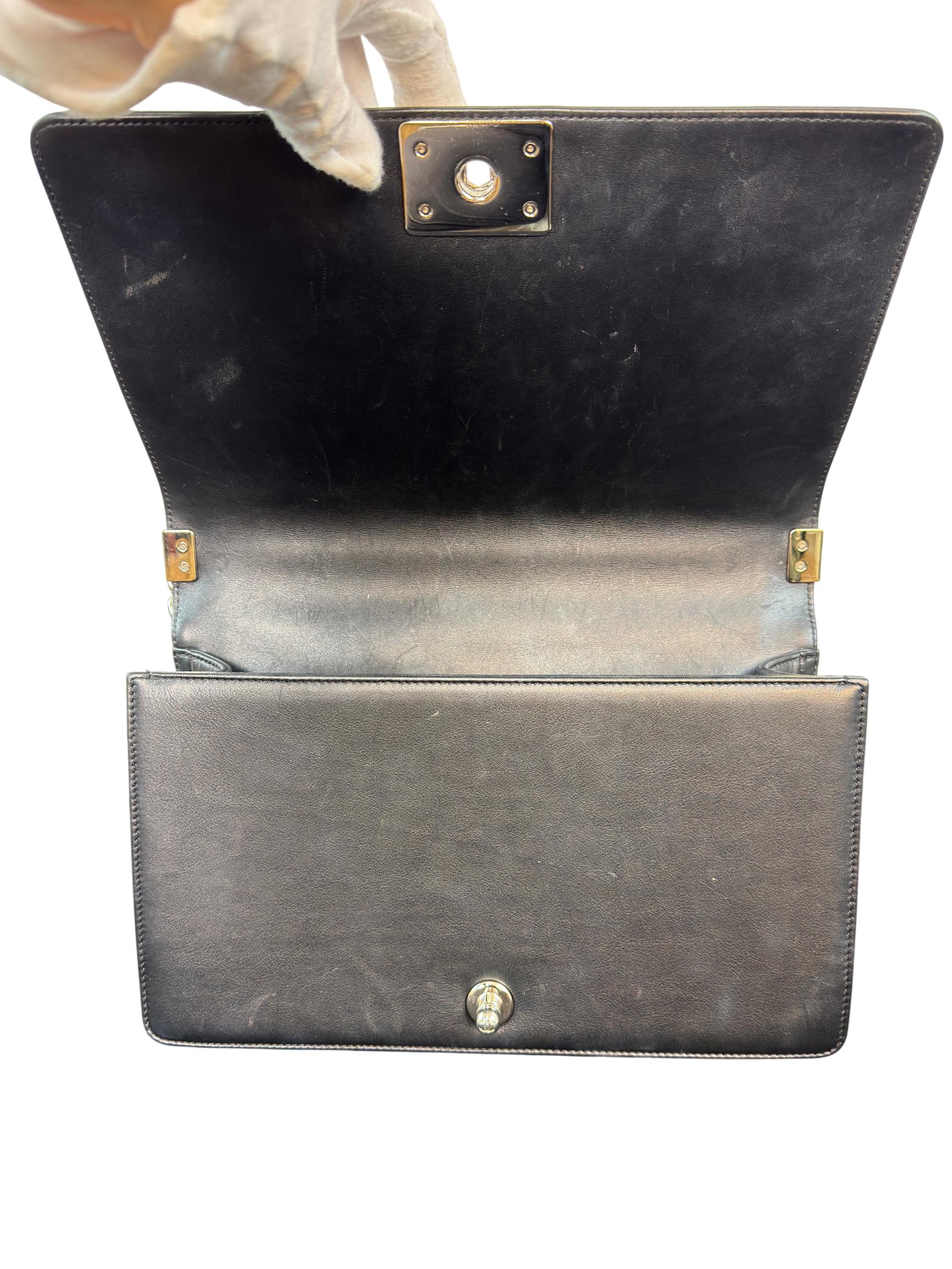 Chanel Boy Bag Large Black Lambskin with Silver-Tone Chain features a luxurious black chevron-quilted lambskin leather exterior complemented by a distinctive silver-tone chain strap and signature Chanel logo. This medium-sized shoulder bag offers timeless elegance and versatility, perfect for everyday wear or special occasions. Crafted with premium materials, it embodies classic Chanel craftsmanship and style.