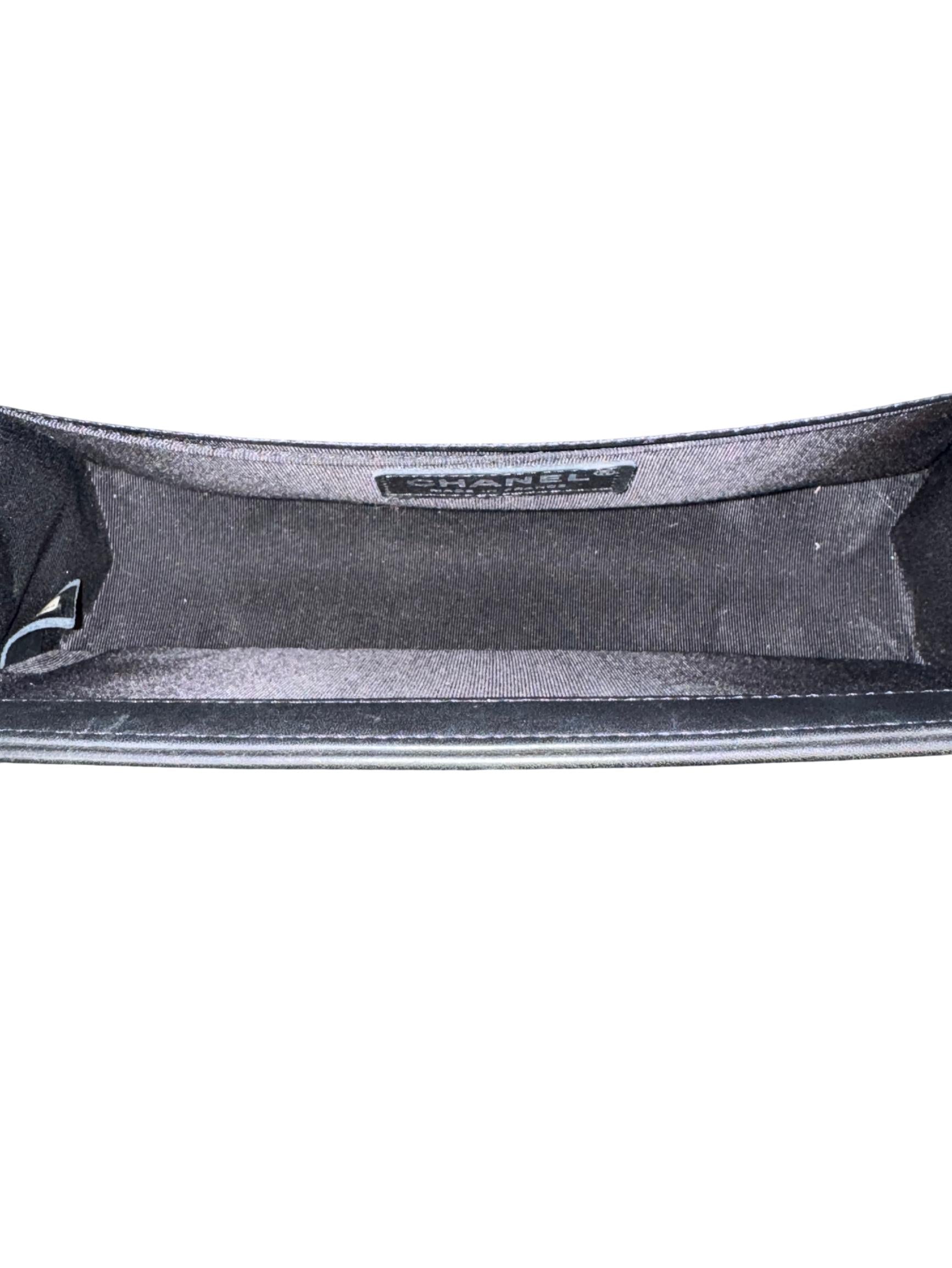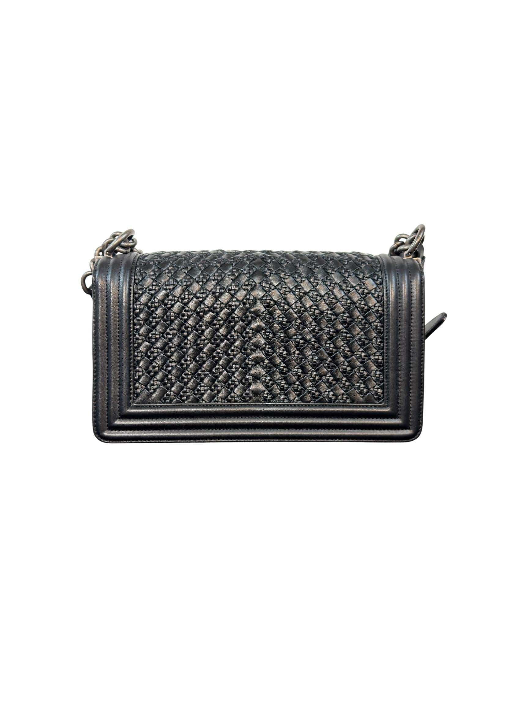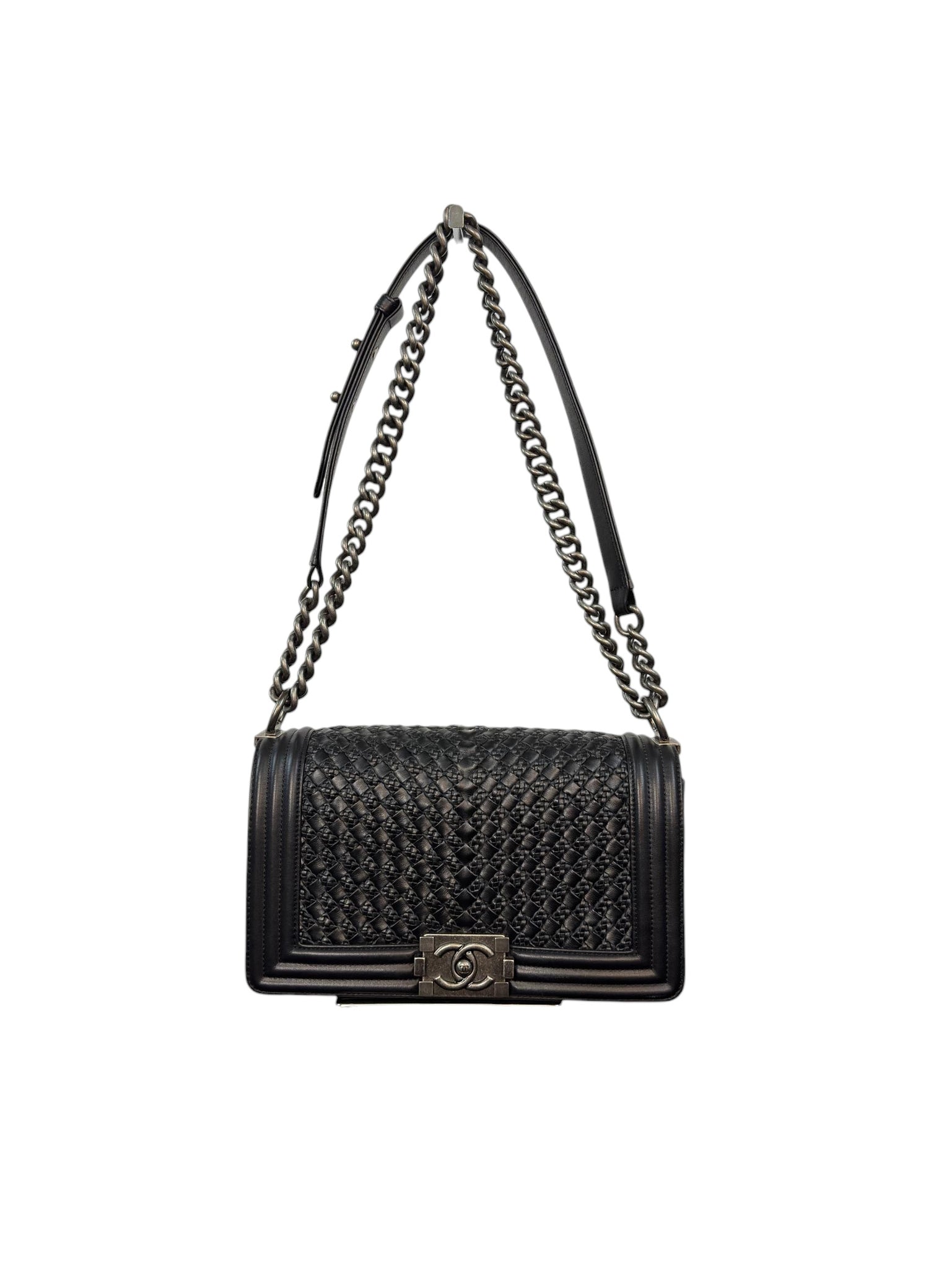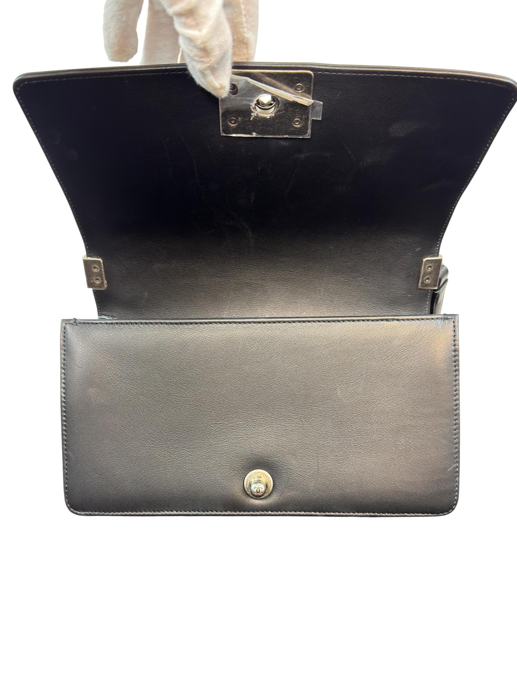Chanel Boy Bag Medium Black Quilted Calfskin Leather with Silver-Tone Chain features a sleek black quilted calfskin leather exterior paired with a durable silver-tone chain strap, exemplifying timeless elegance. This medium-sized shoulder bag blends classic design with modern functionality, making it a luxurious and versatile fashion accessory ideal for everyday use or special occasions.