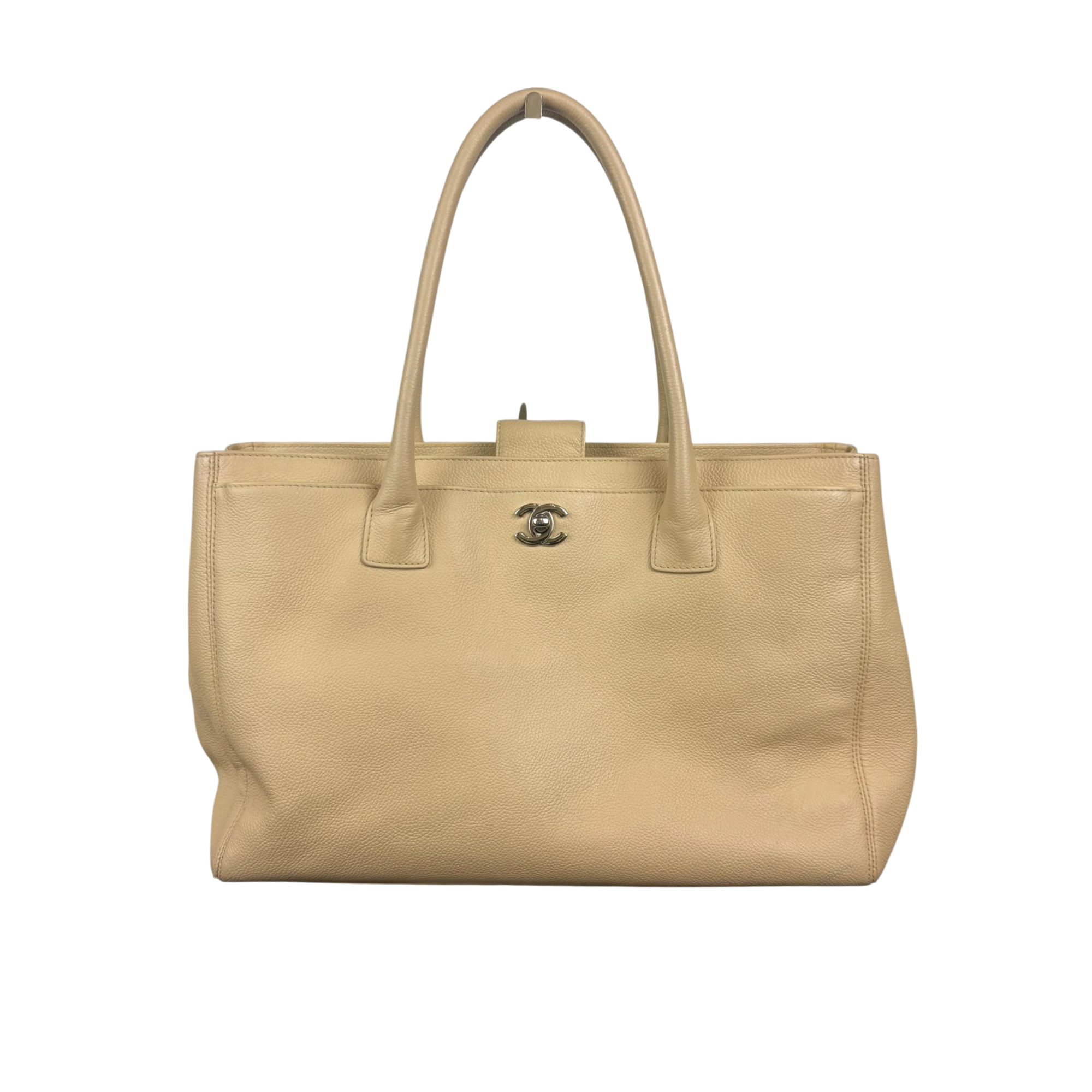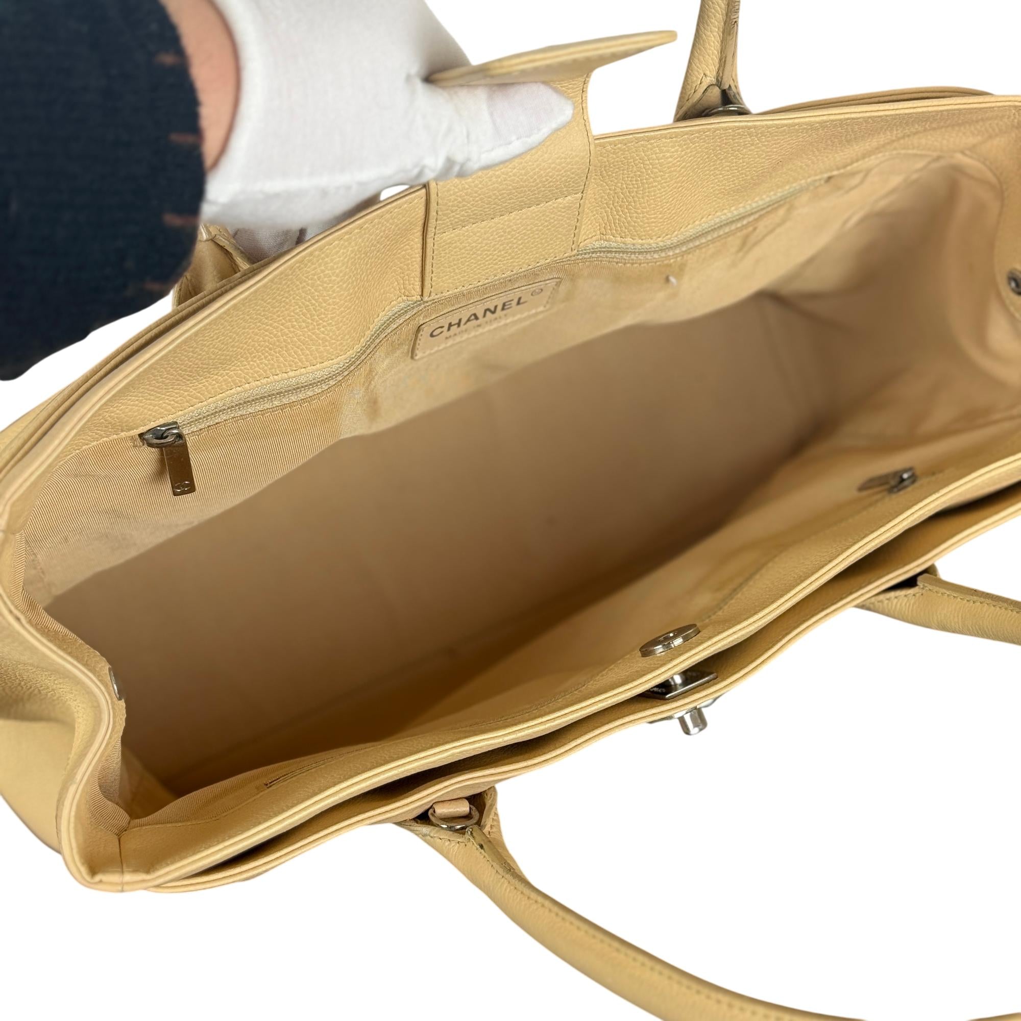 Chanel Cerf Executive Tote Bag Beige Caviar Leather Gold Hardware is a sophisticated beige handbag crafted from durable caviar leather, featuring elegant gold hardware and a spacious interior perfect for everyday use. This medium-sized tote combines timeless design with practical functionality, making it a must-have luxury accessory for fashion enthusiasts.