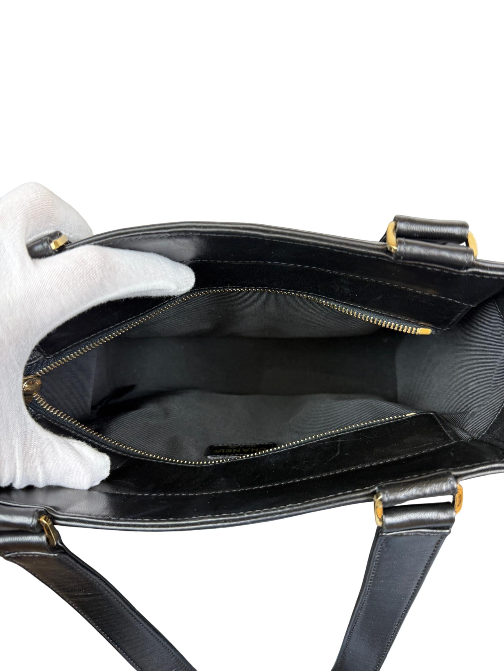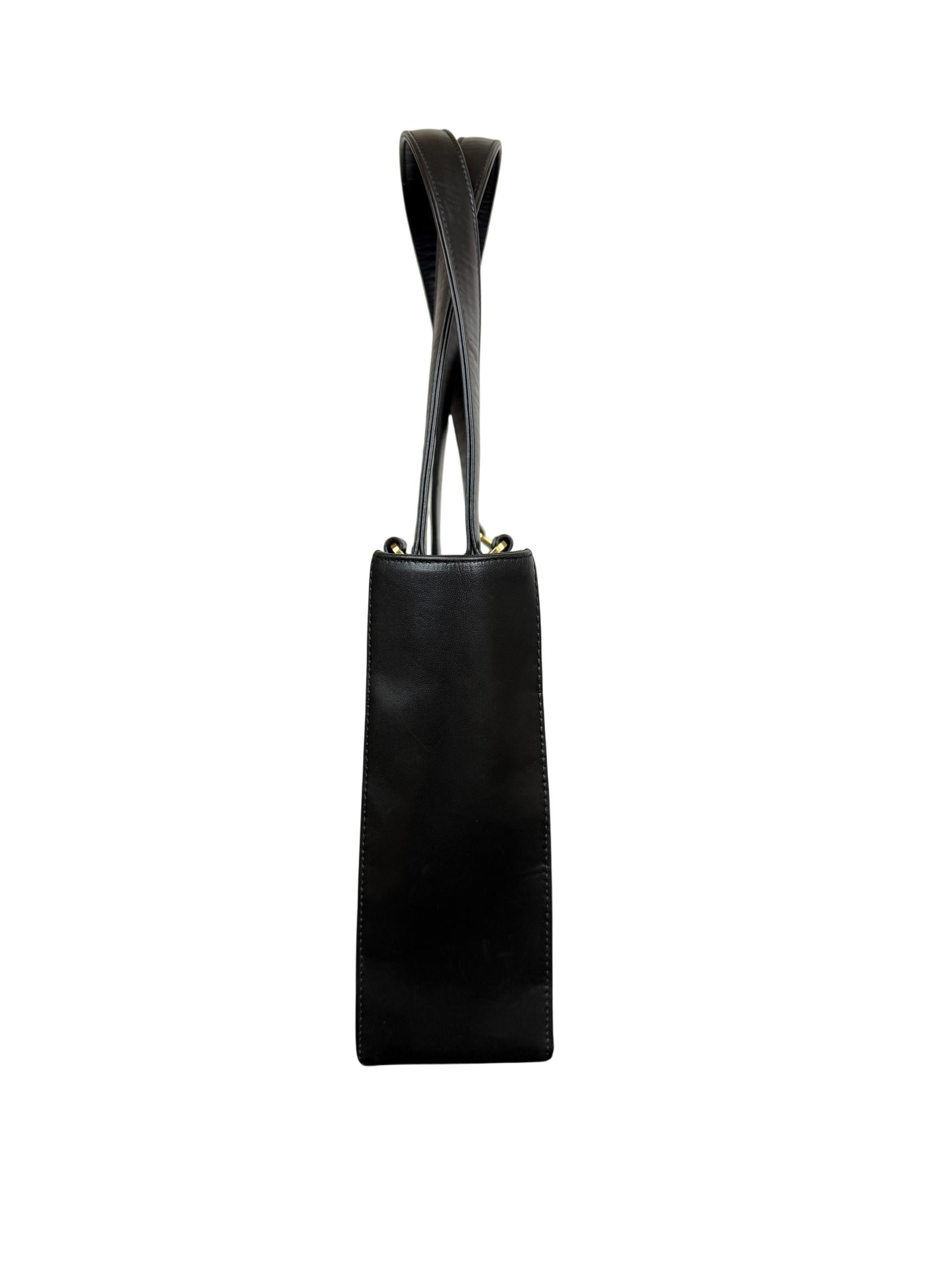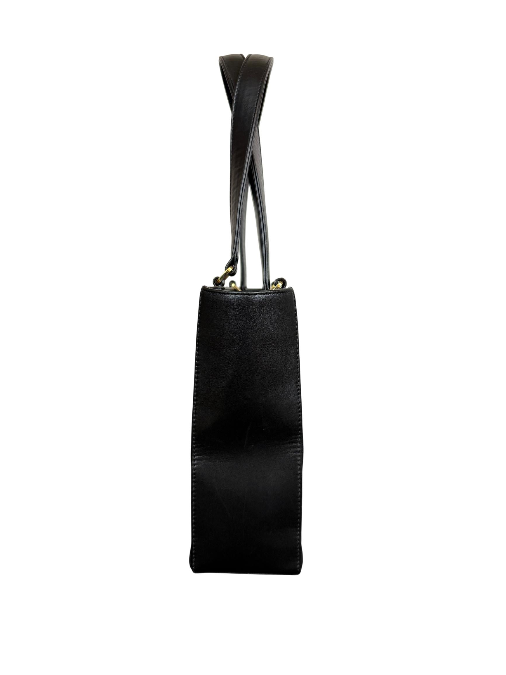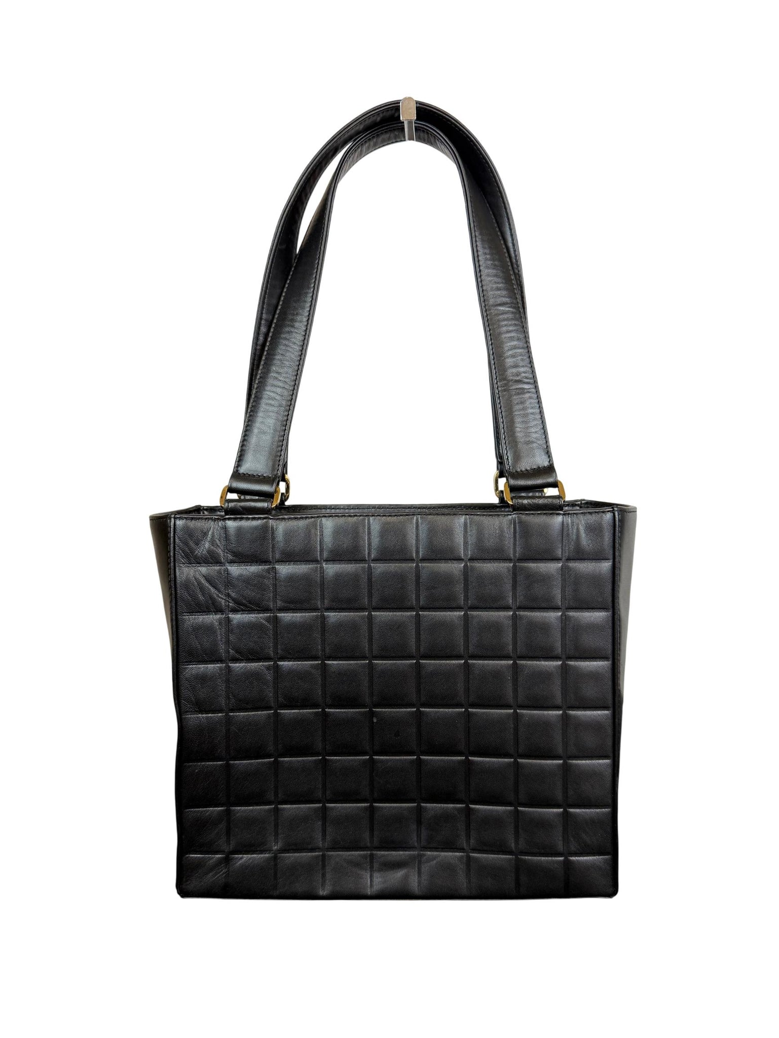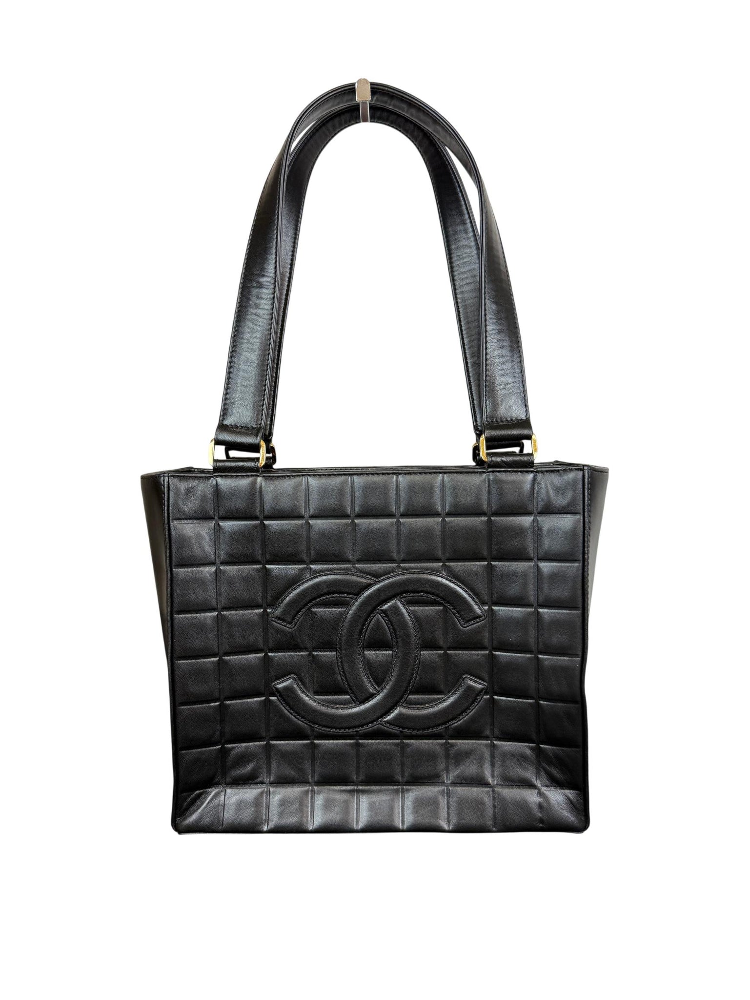 Experience timeless elegance with this Chanel Chocolate Bar CC Tote, crafted from luxurious black quilted lambskin leather and adorned with the iconic interlocking CC logo. Designed for both sophistication and practicality, this sought-after shoulder bag easily transitions from day to night, making it a perfect addition to any fashion enthusiast's collection.