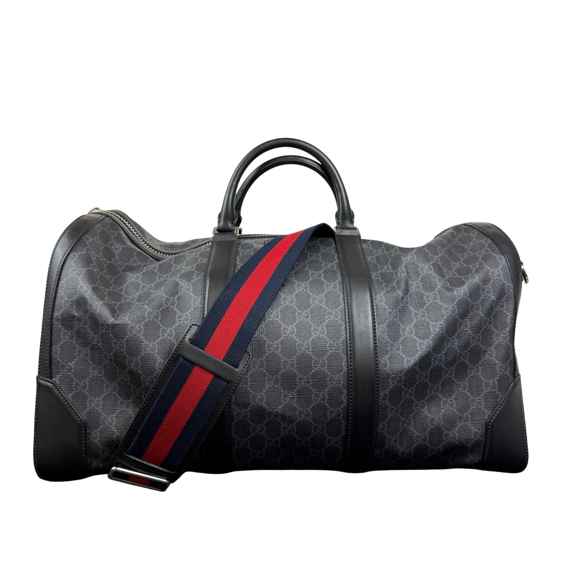 Gucci GG Supreme Black Large Duffle Bag is a luxury leather travel bag featuring signature GG Supreme canvas with black leather trim and silver hardware. Designed for durability and style, it includes a secure zipper closure and comfortable black leather handles, perfect for weekend getaways or hand luggage.