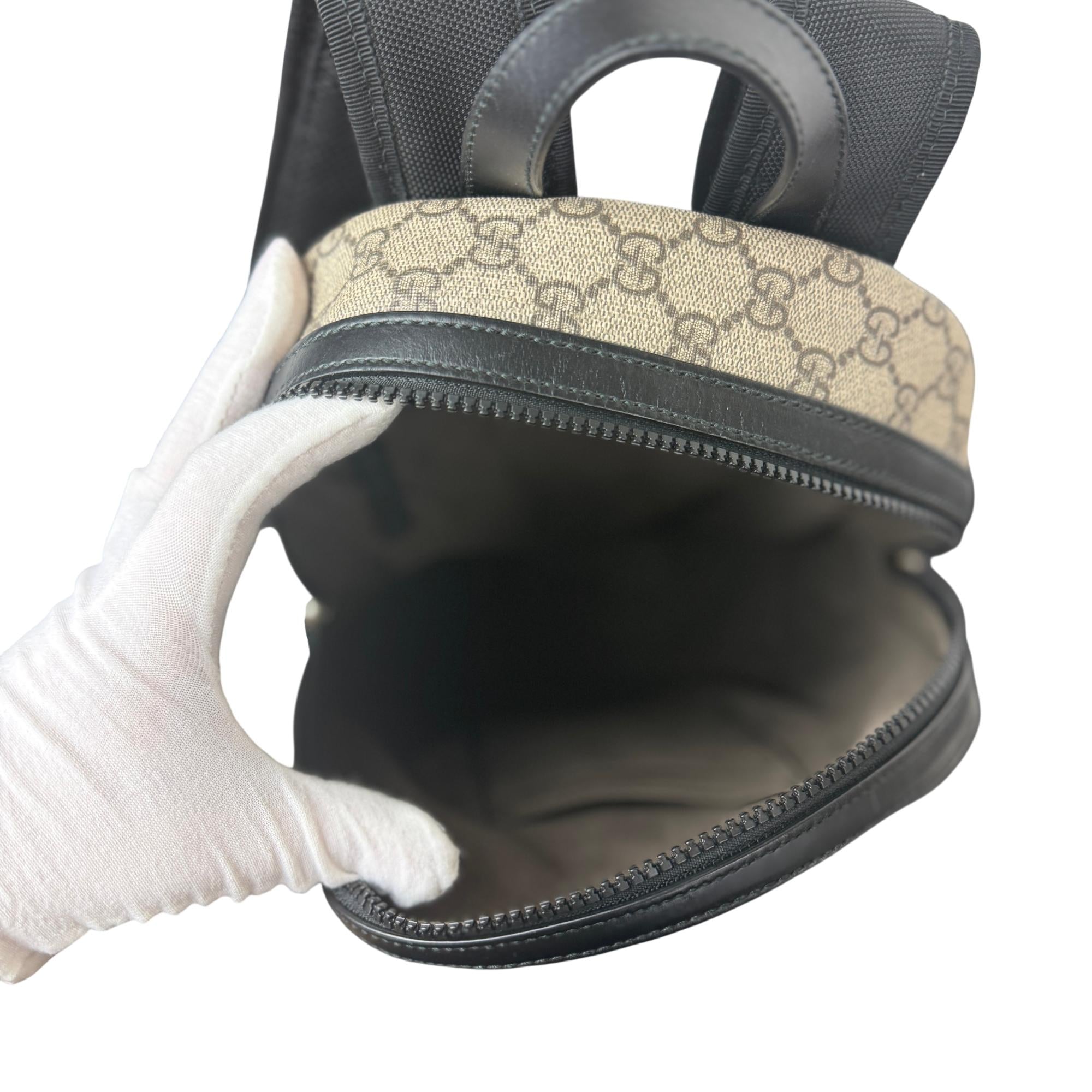 Gucci GG Supreme Eden Small Backpack 429020 KLQAX Beige/Ebony Black features the iconic GG Supreme coated canvas with black leather straps and detailed zipper accents. This pre-owned luxury backpack combines durable materials with stylish design, perfect for everyday use or travel. Ideal for fans of high-end accessories, it includes a discreet Gucci logo and premium craftsmanship.