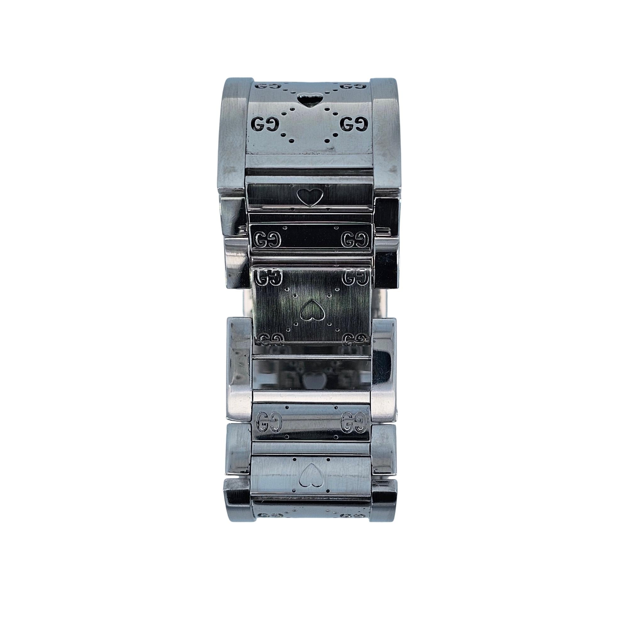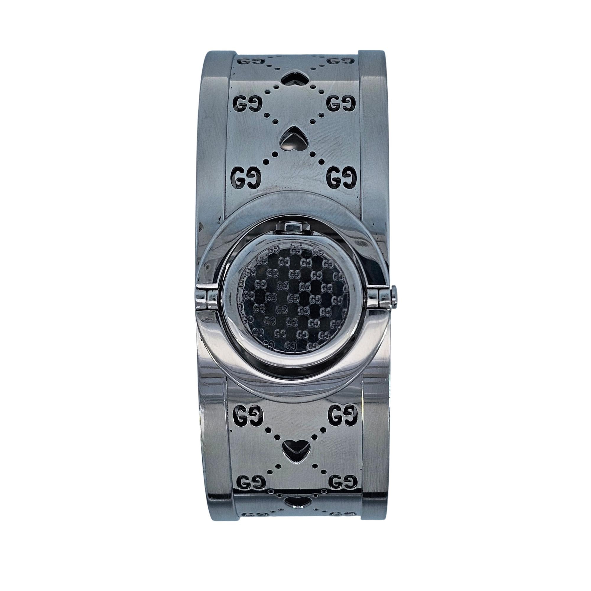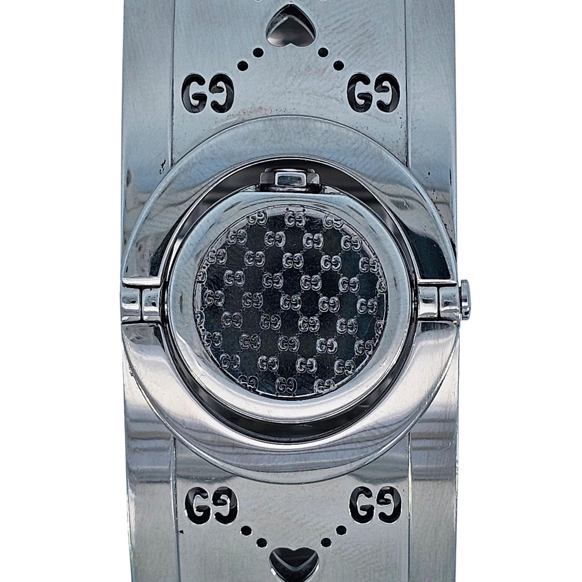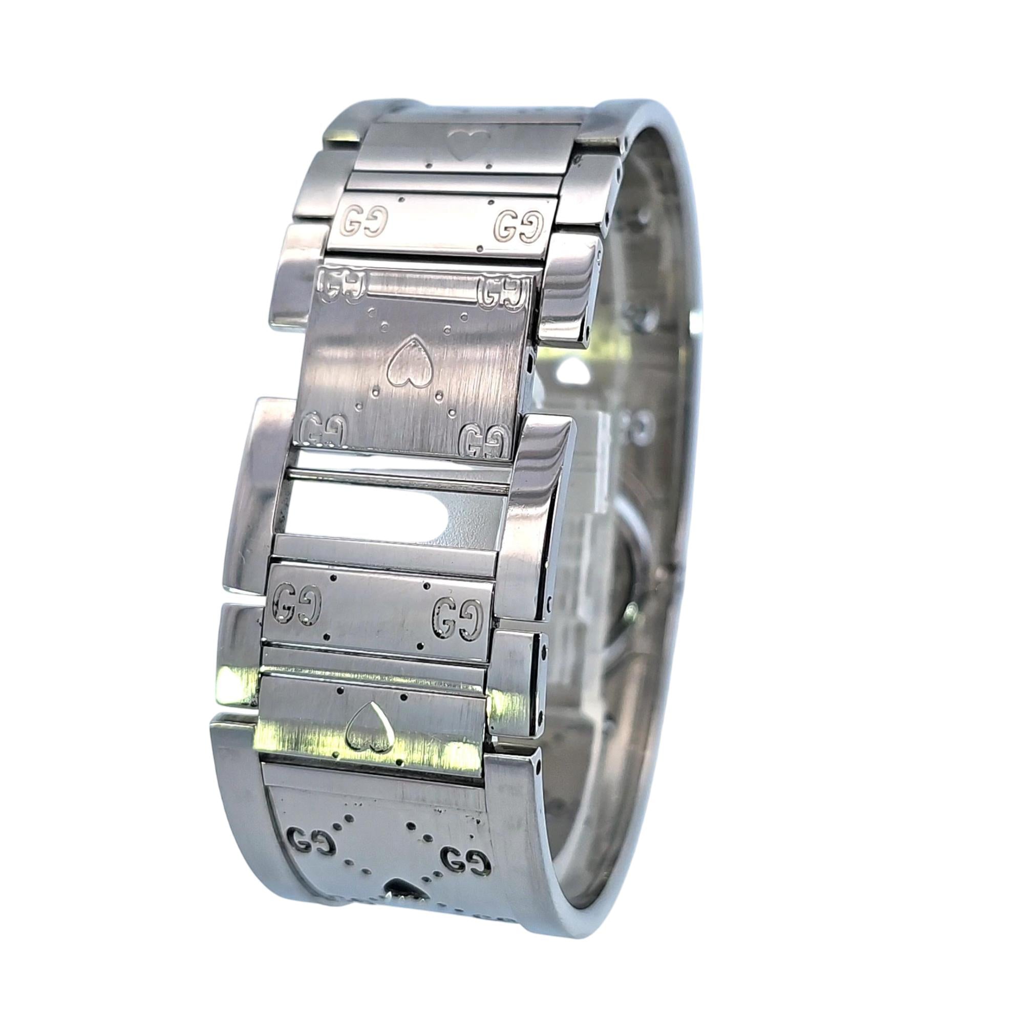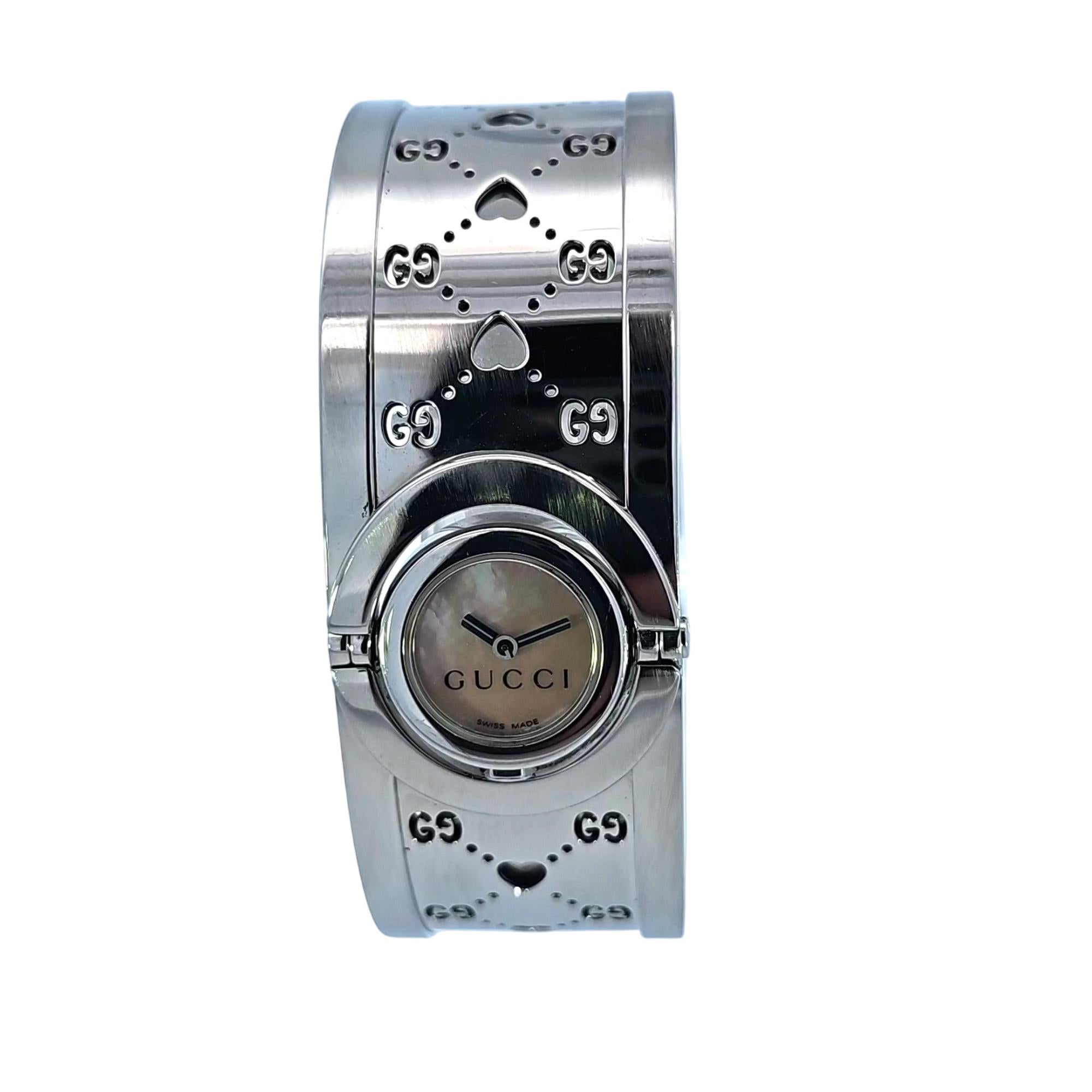 Gucci Twirl Heart Bangle Ladies Wristwatch YA112501 is a polished stainless steel timepiece featuring a unique heart-shaped bangle design and a sleek silver shell dial. This luxury Swiss quartz watch combines elegant style with precision craftsmanship, making it a perfect accessory for sophisticated women. Optimized for Gucci, ladies wristwatch, heart bangle, and luxury watches.