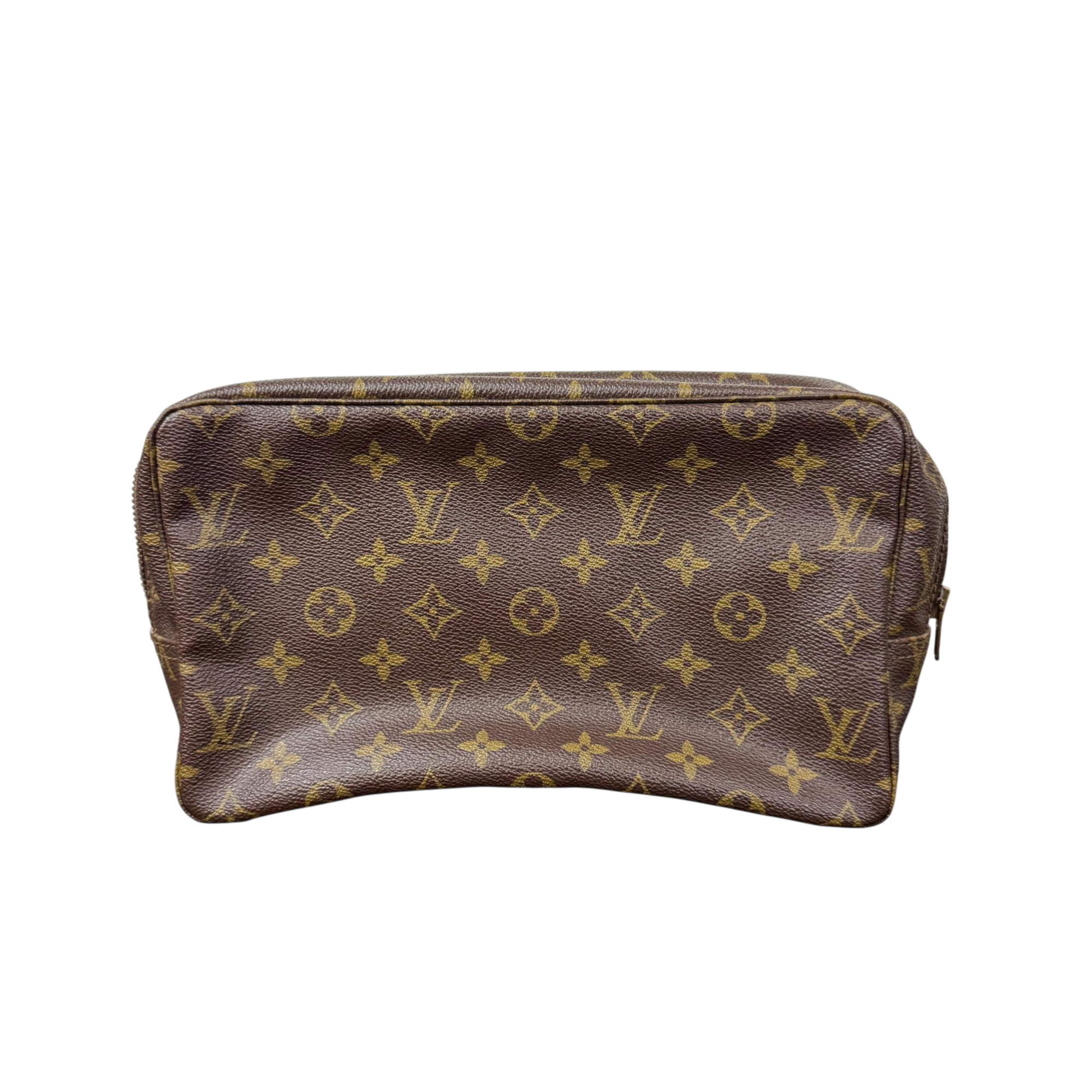 Louis Vuitton Monogram Canvas Trousse Toilette 28 Cosmetic Pouch features the iconic brown monogram canvas with gold-tone zipper and logo accents. This vintage cosmetic pouch combines luxury leather craftsmanship with practical design, ideal for carrying your essentials in style.