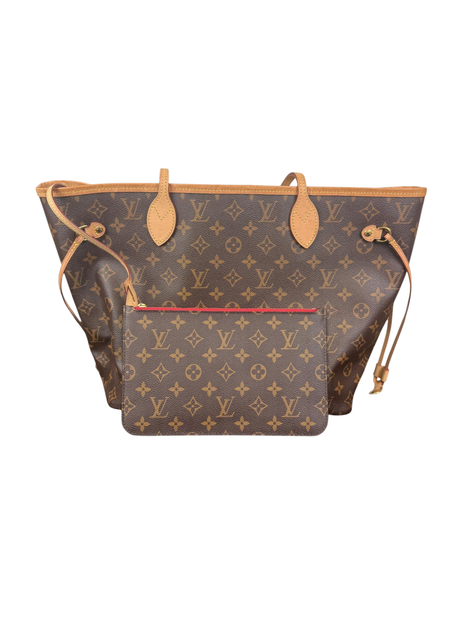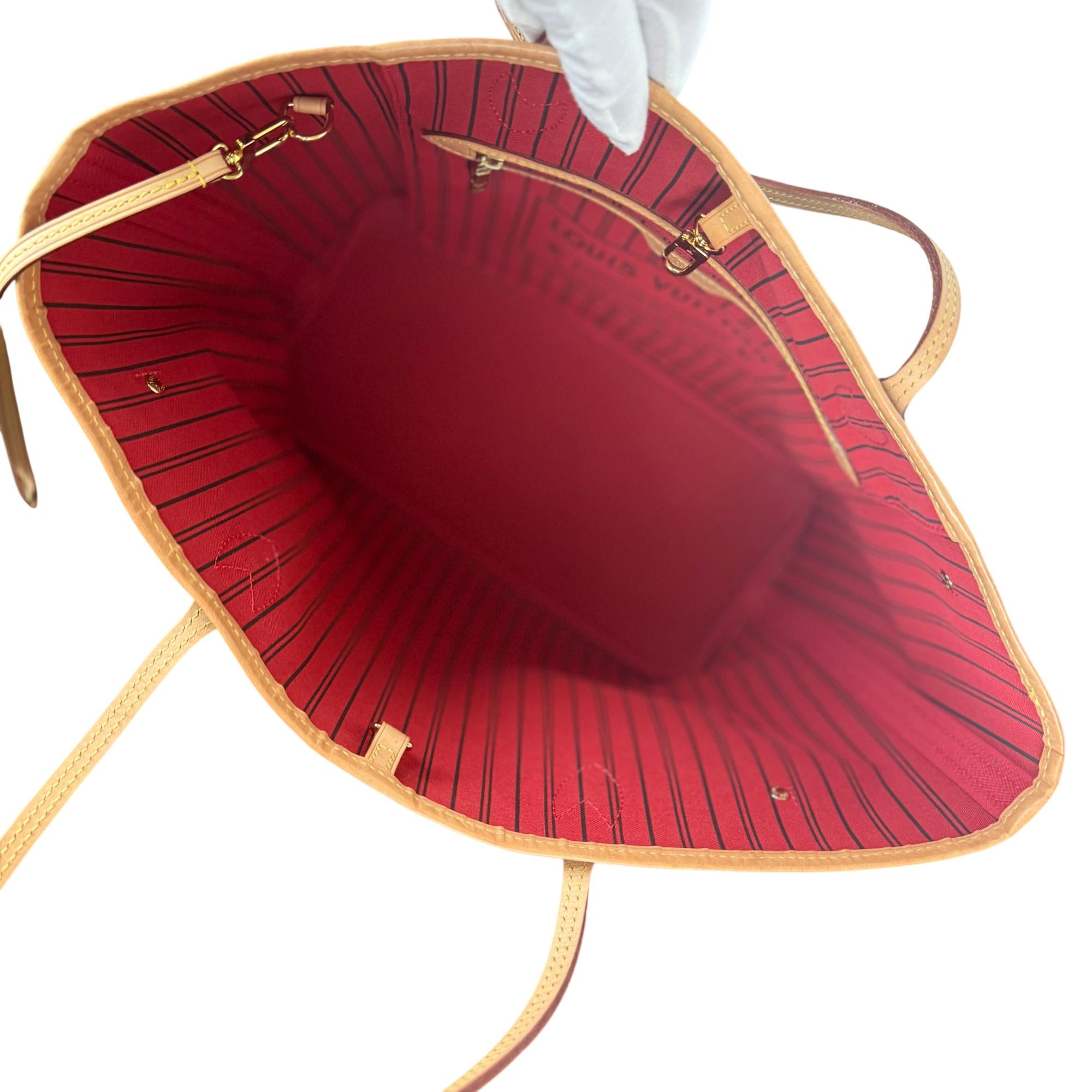Louis Vuitton Neverfull MM Monogram Canvas Tote Bag (Cherry Red Interior) features the iconic LV monogram coated canvas with durable leather trim and a vibrant cherry red interior. This mid-size tote offers spacious functionality with adjustable side straps and a soft, supple leather handle, making it a versatile and stylish accessory for everyday use. Perfect for fashion enthusiasts seeking a timeless luxury handbag with practical design and high-quality craftsmanship.