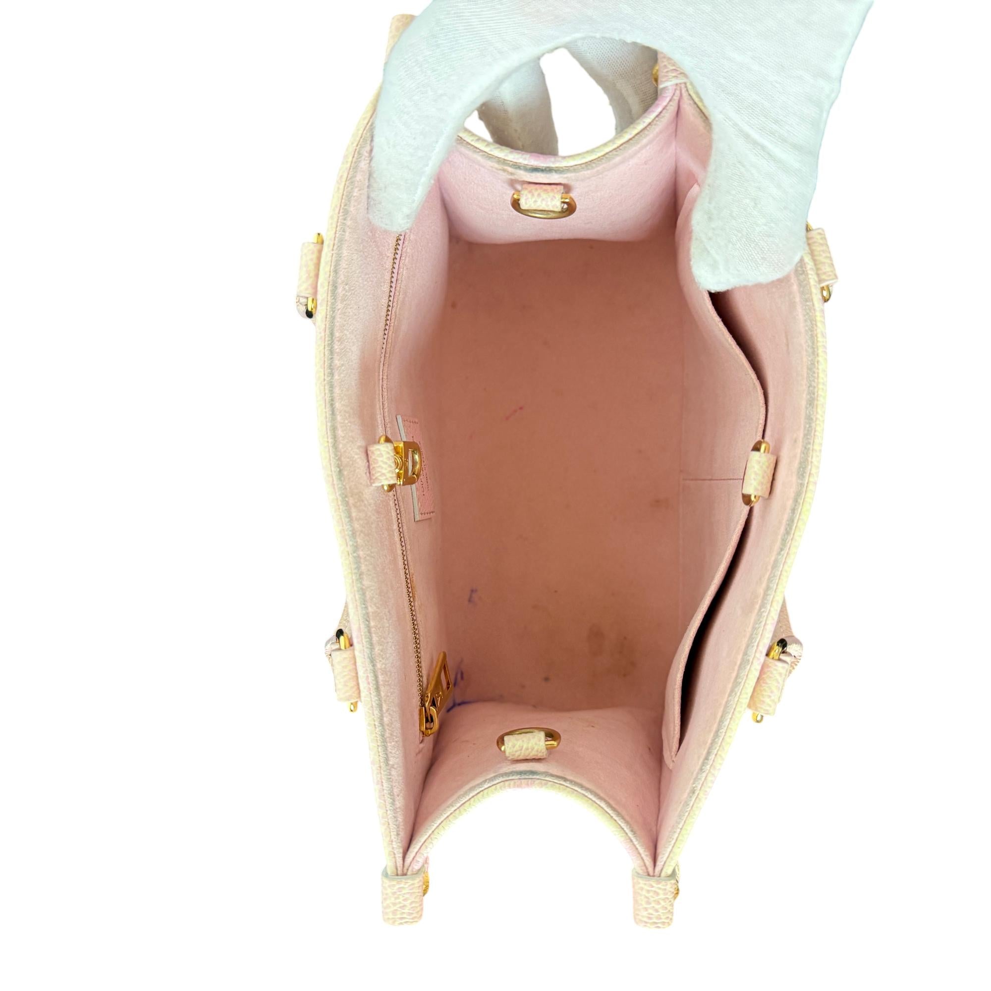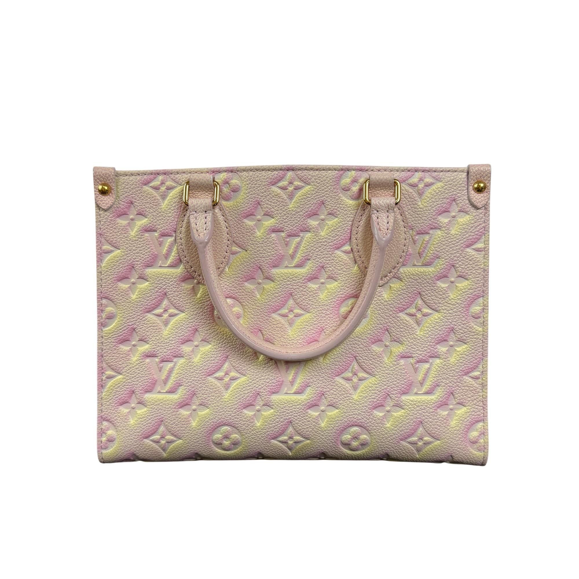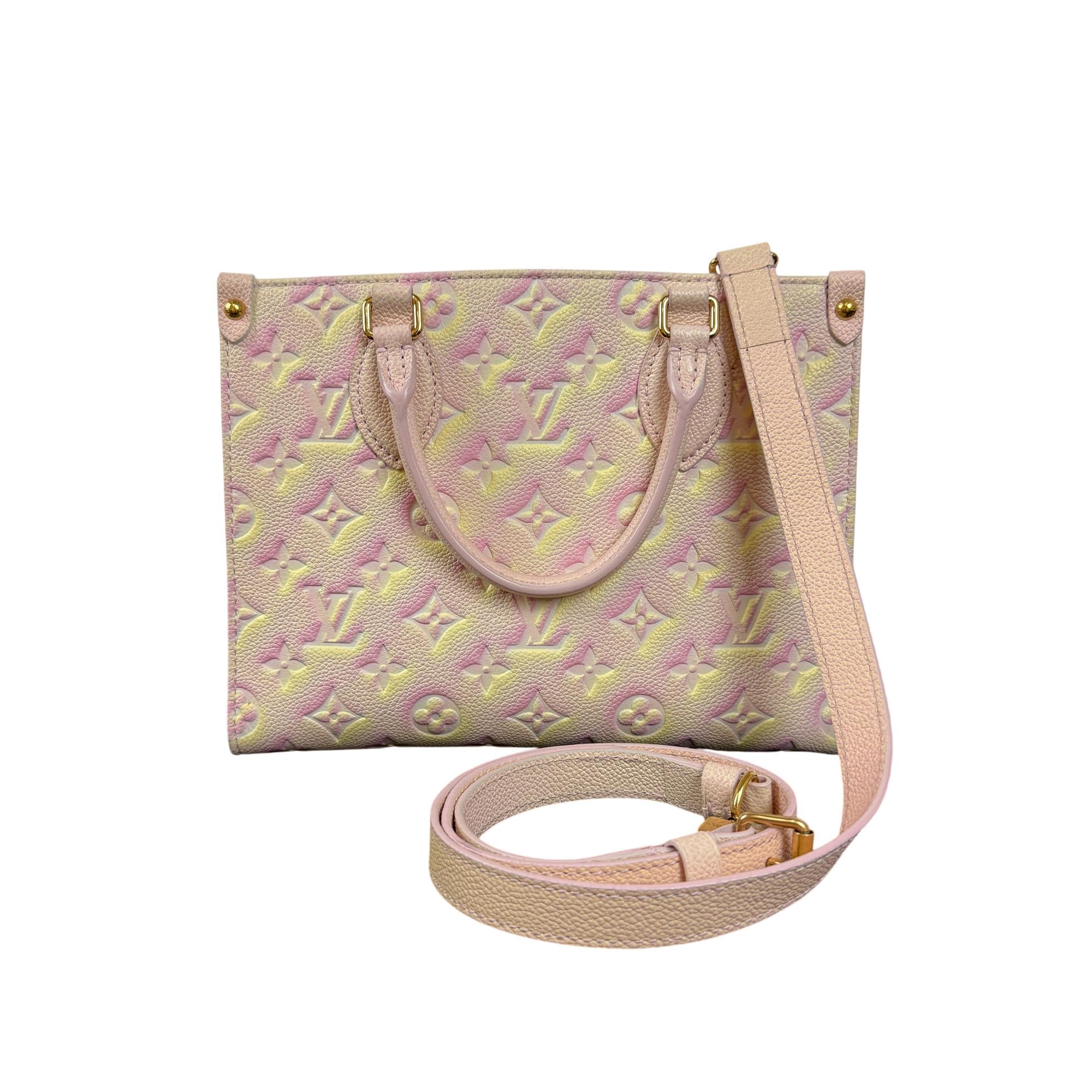 Louis Vuitton OnTheGo MM Monogram Empreinte Giant Bicolour Tote Bag, Pink and Yellow features the iconic monogram embossed on soft Empreinte leather in vibrant pink and yellow hues. This stylish tote includes gold-tone hardware and a spacious interior, making it both a fashionable and functional accessory for everyday use.