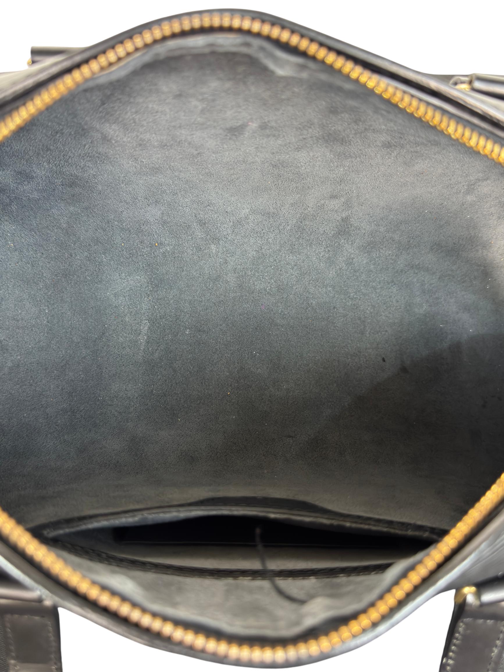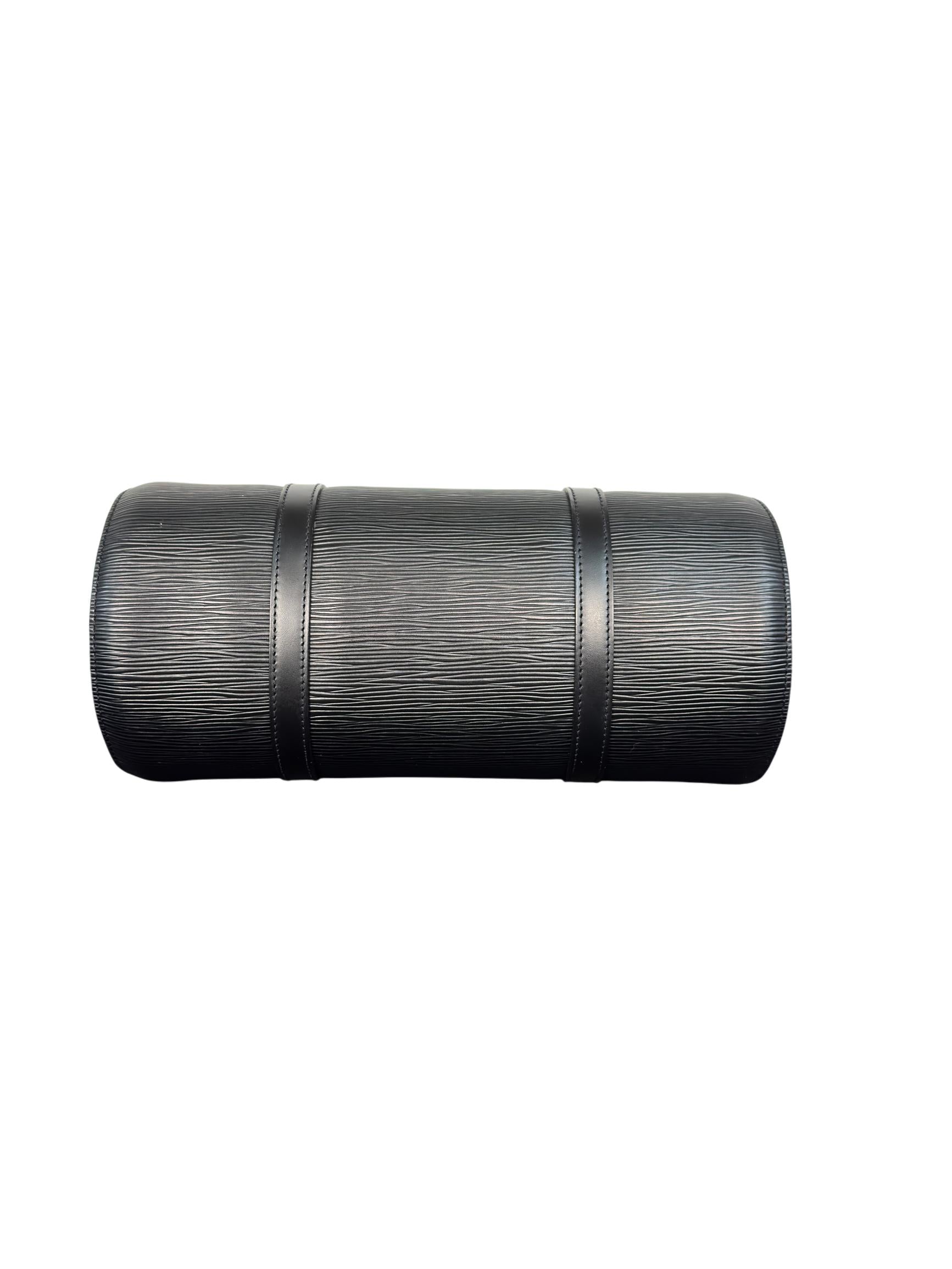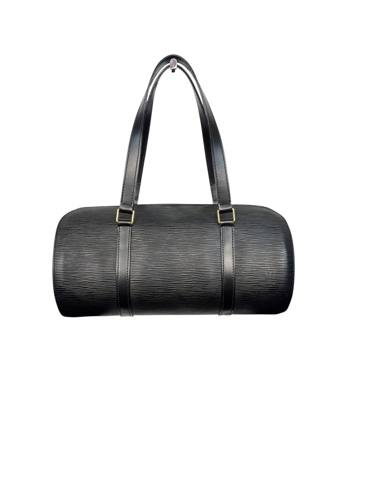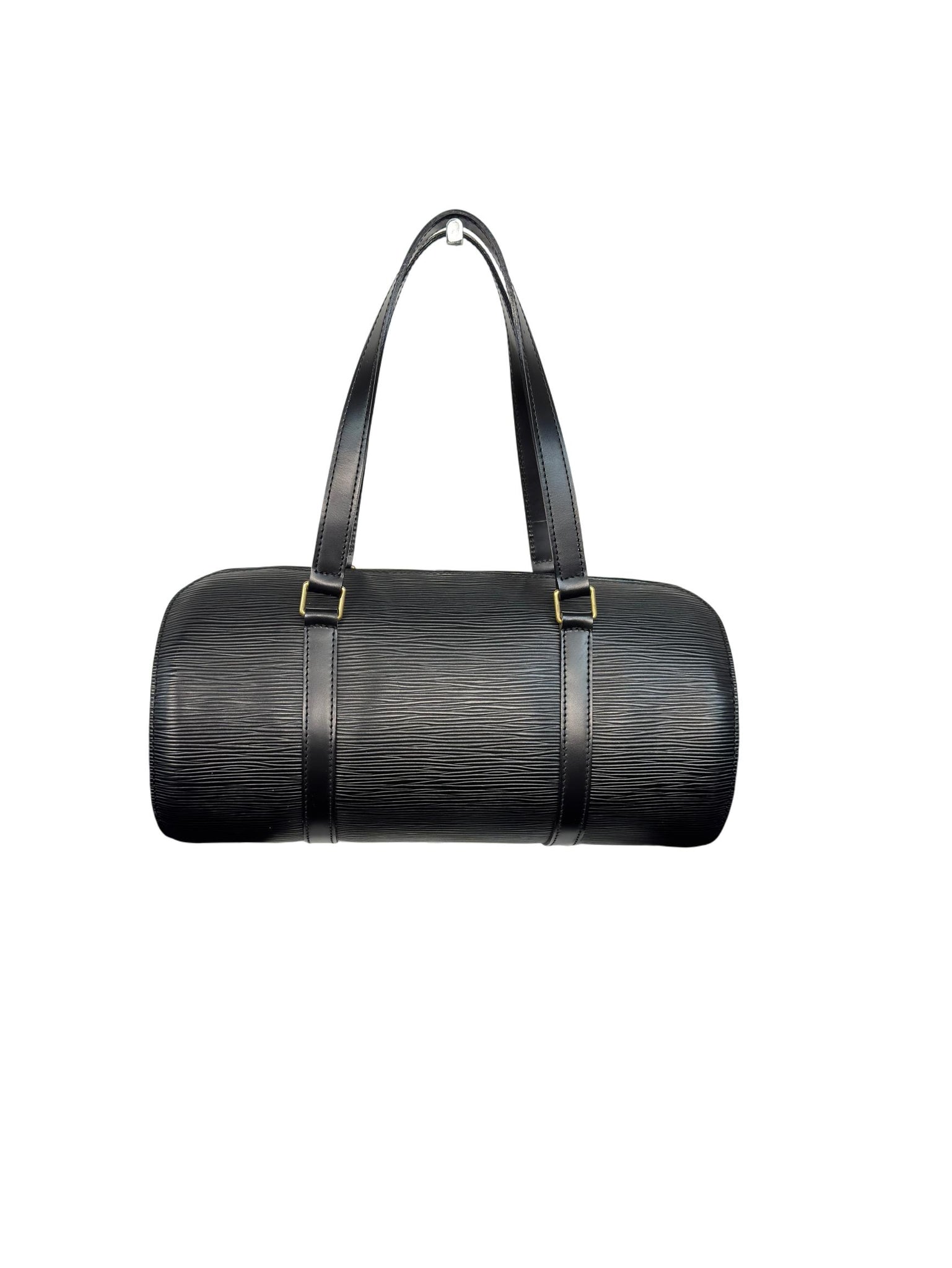 Elevate your style with the iconic Louis Vuitton Epi Soufflot Black Barrel Handbag. Featuring luxurious black Epi leather, distinctive gold-tone hardware, and a unique cylindrical silhouette, this vintage designer piece blends elegance and practicality for any occasion. Ideal for fashion aficionados seeking a timeless, collectible accessory.