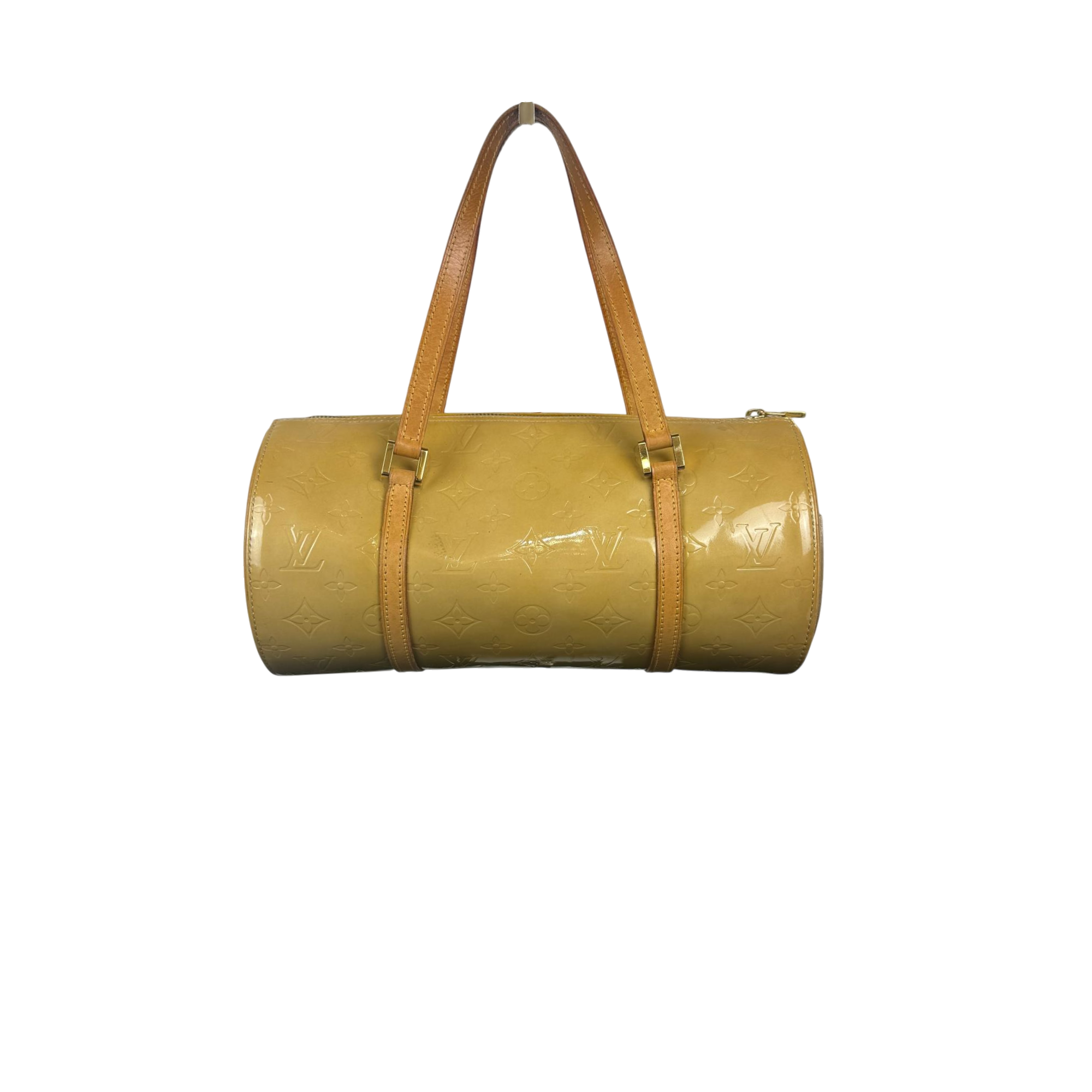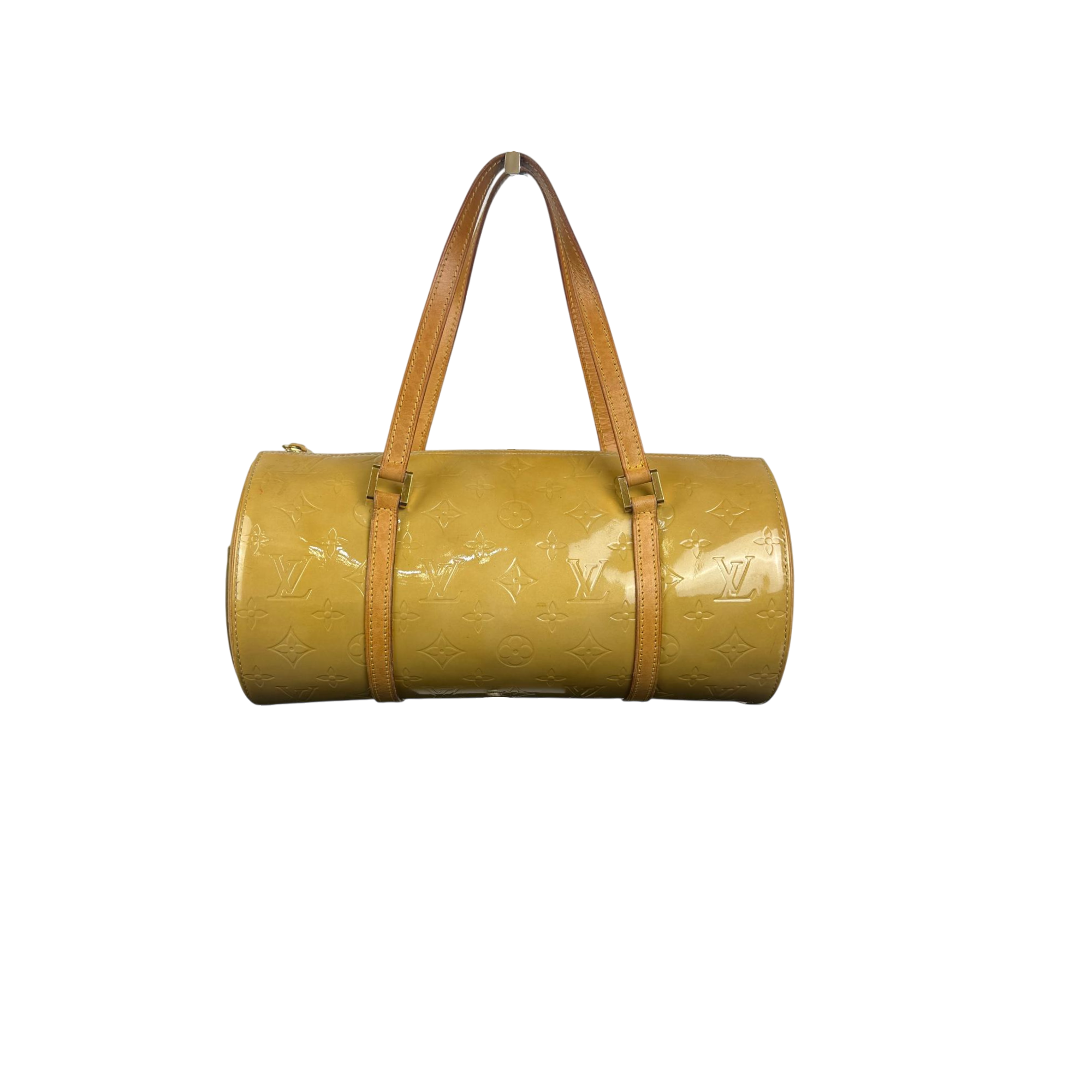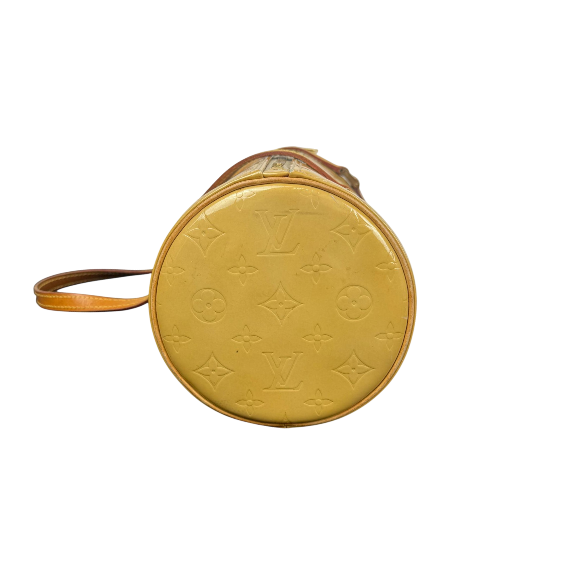Louis Vuitton Vernis Bedford Papillon Barrel Bag - Gold/Yellow Patent Leather is a luxurious round handbag featuring the brand's signature patent leather with a glossy gold and yellow finish. This vintage shoulder bag combines elegant design with high-quality leather straps, making it a standout fashion accessory perfect for adding a sophisticated touch to any outfit.