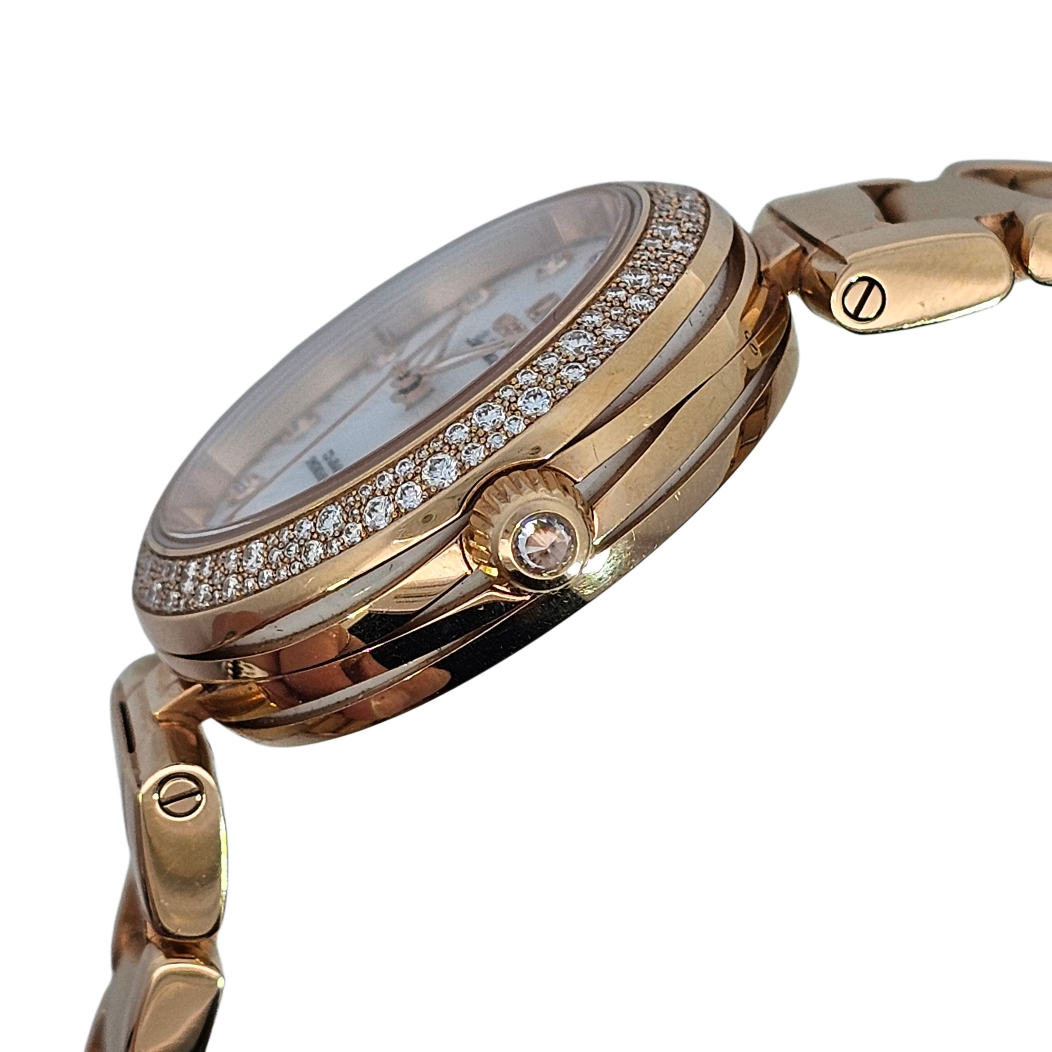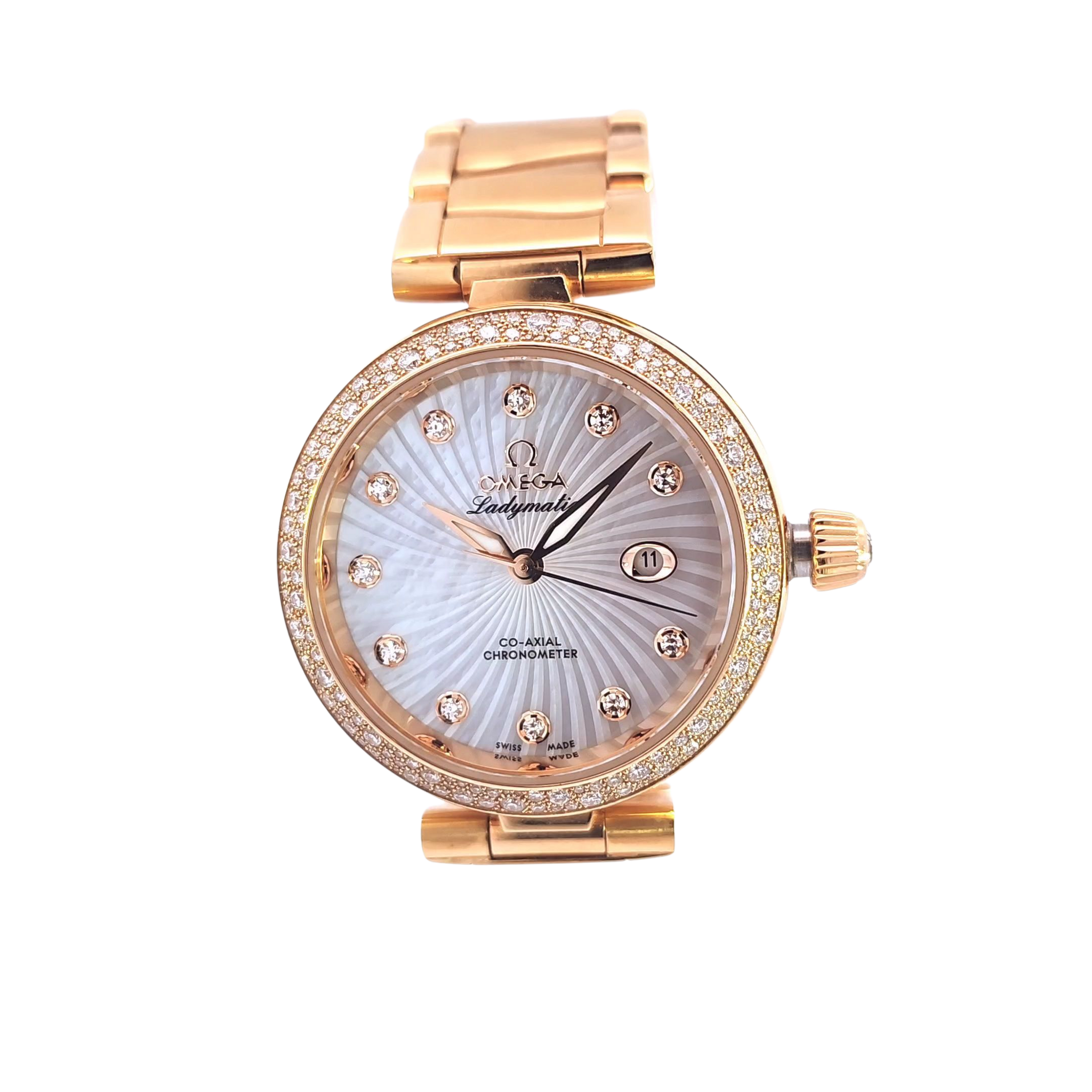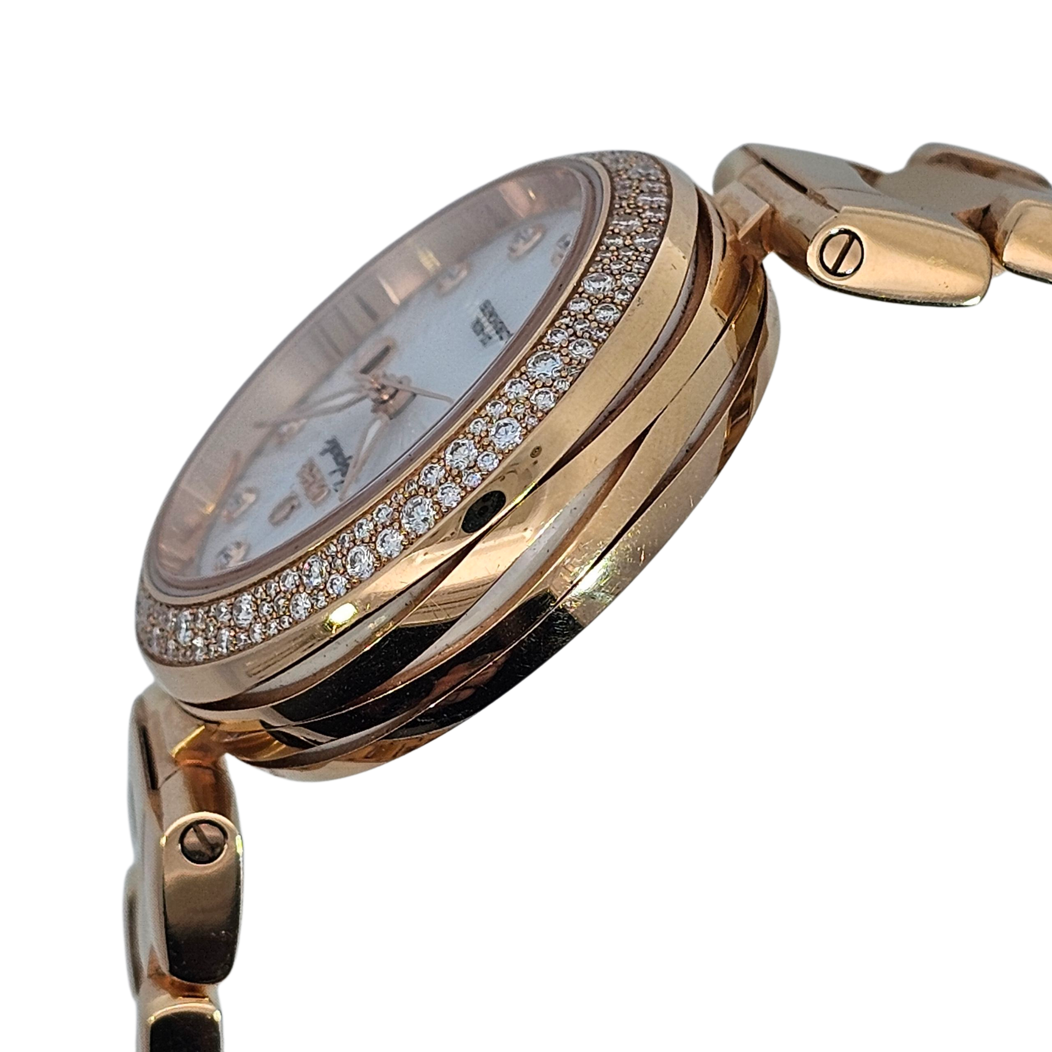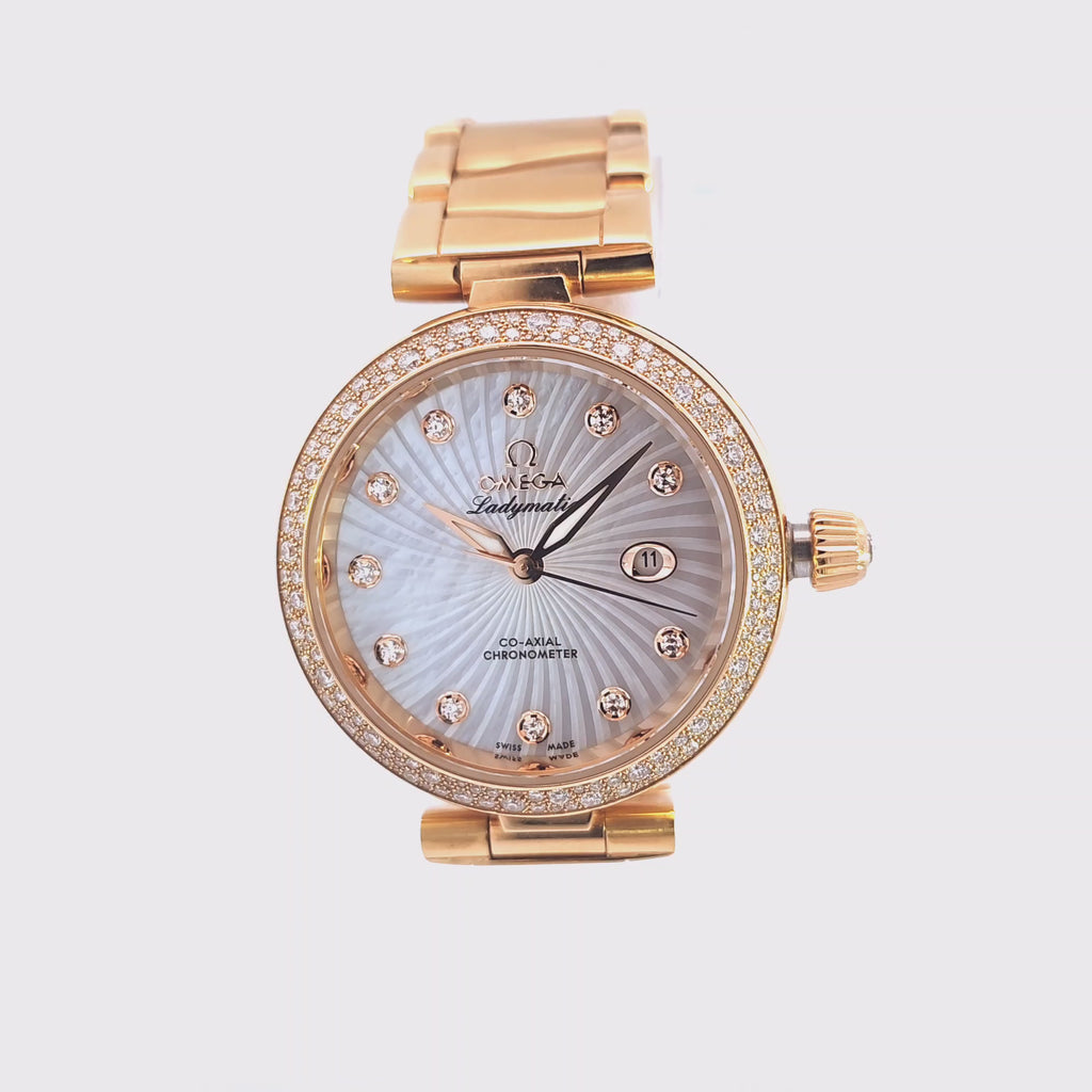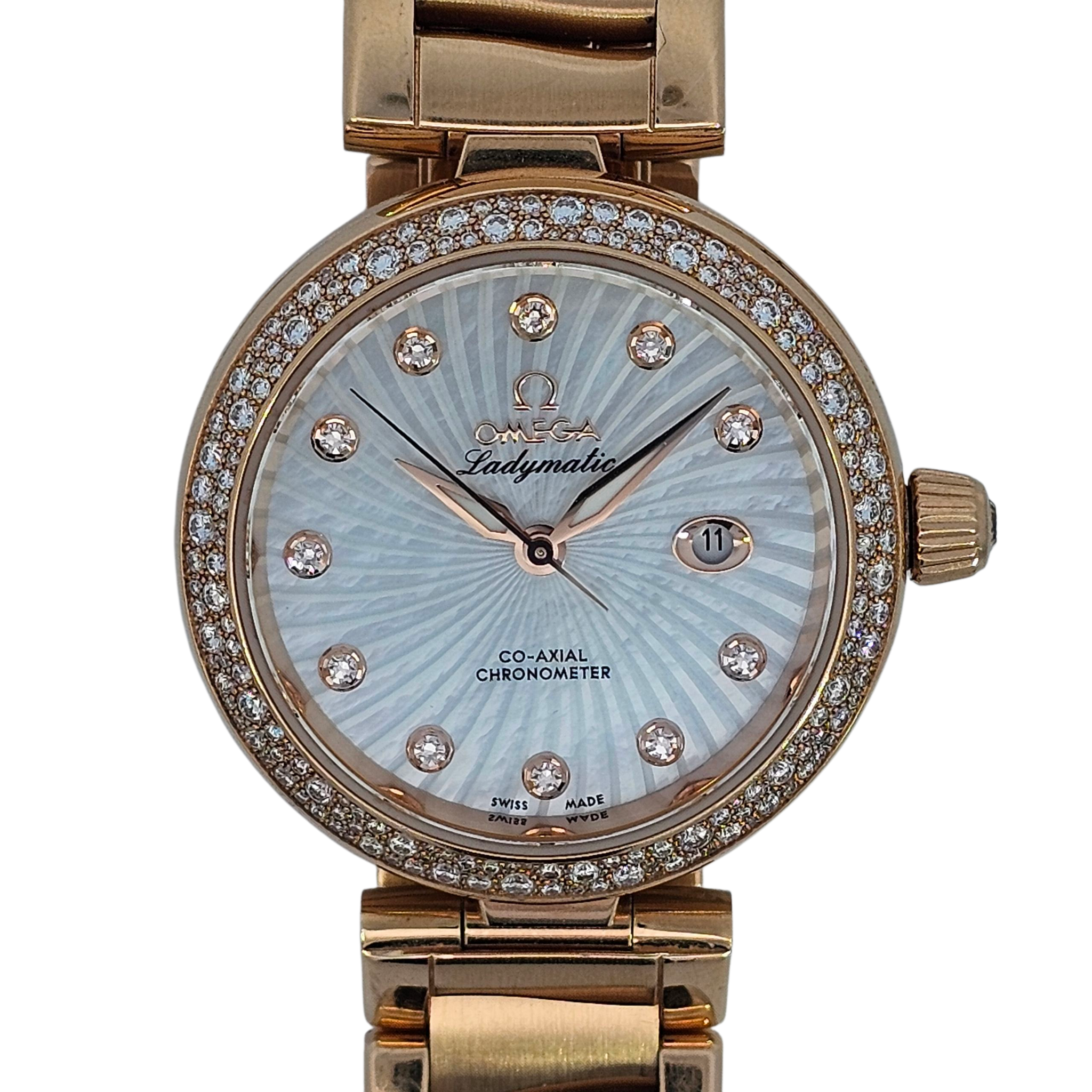 The Omega De Ville Ladymatic 28mm is a dazzling expression of luxury and precision. Crafted in 18K rose gold with a mother of pearl dial, diamond hour markers, and a full diamond-set bezel and bracelet, this timepiece blends fine watchmaking with striking elegance.