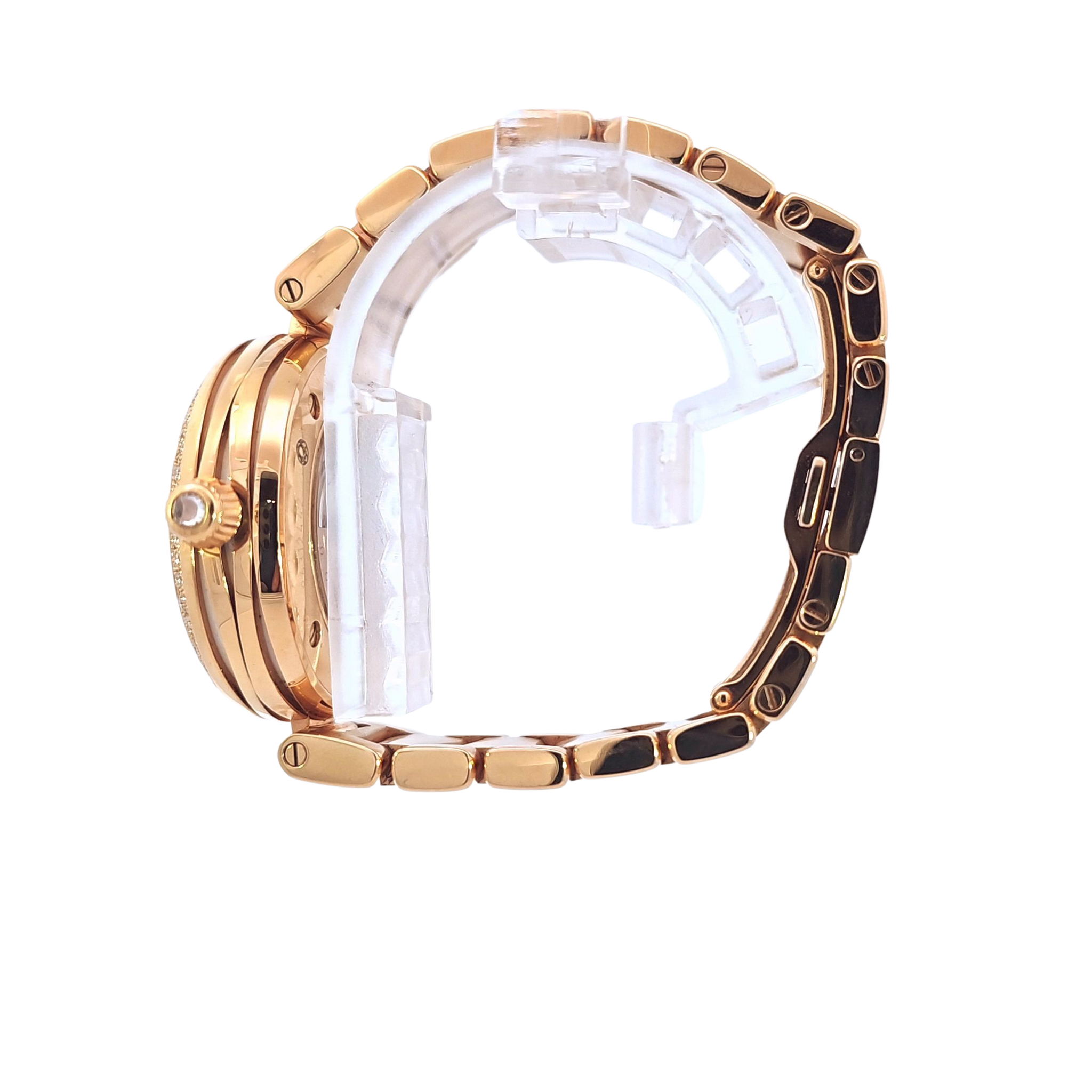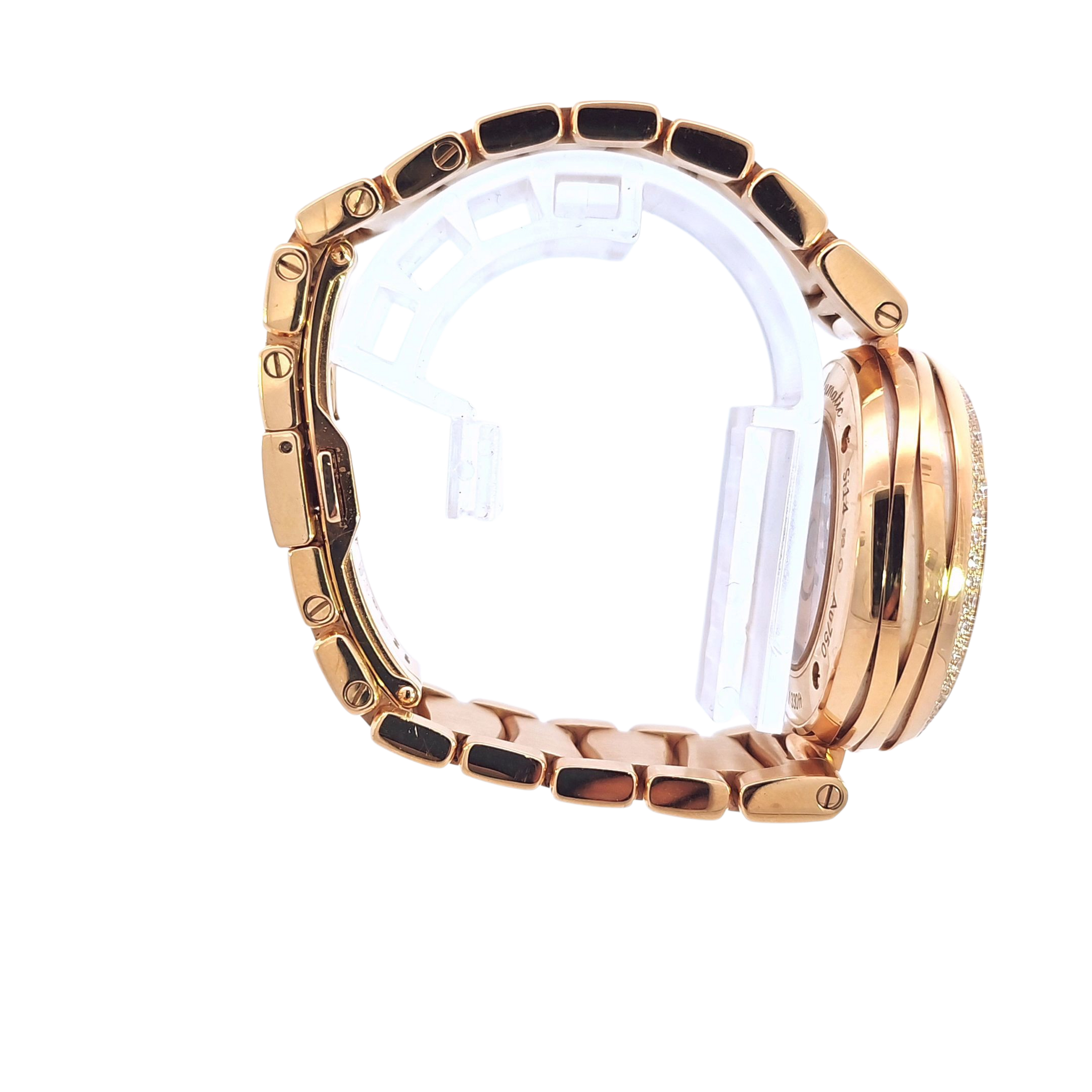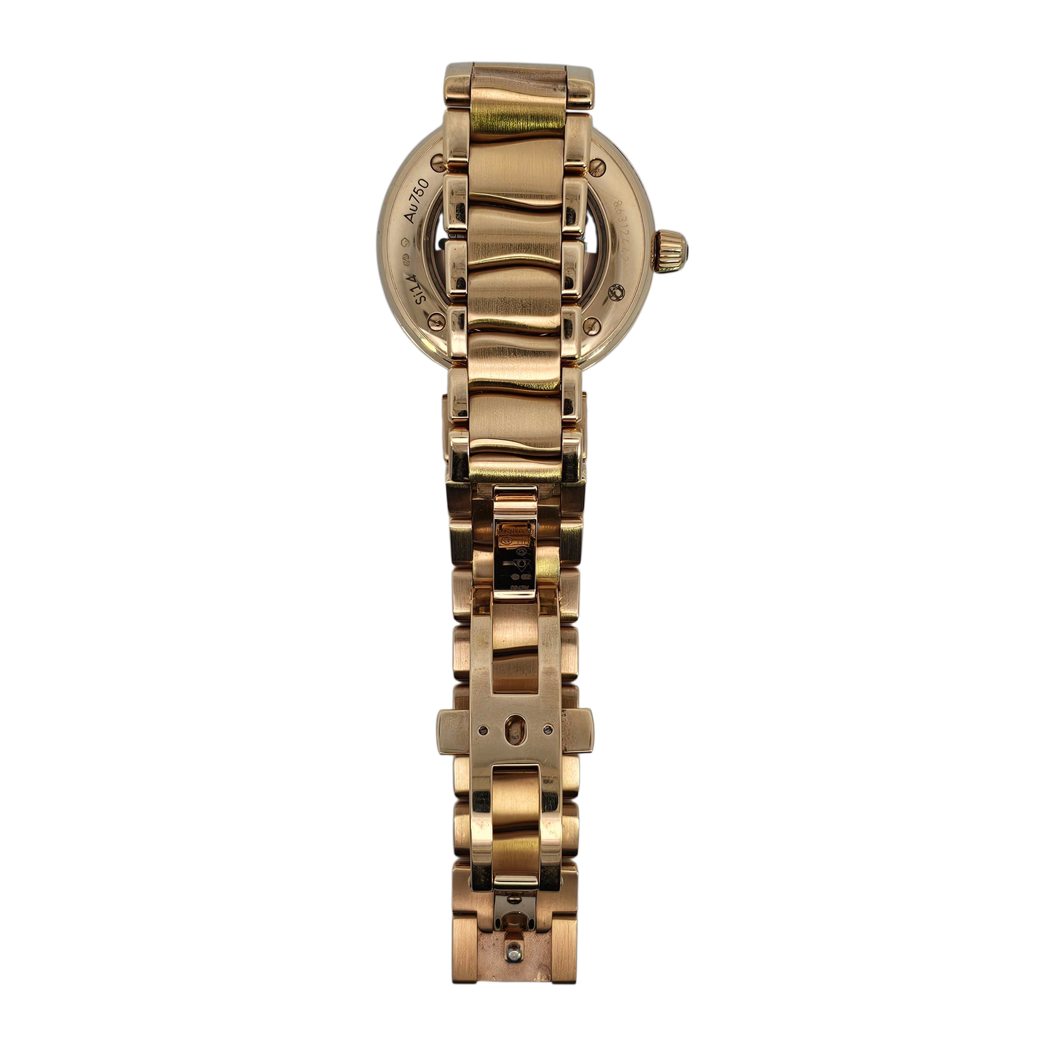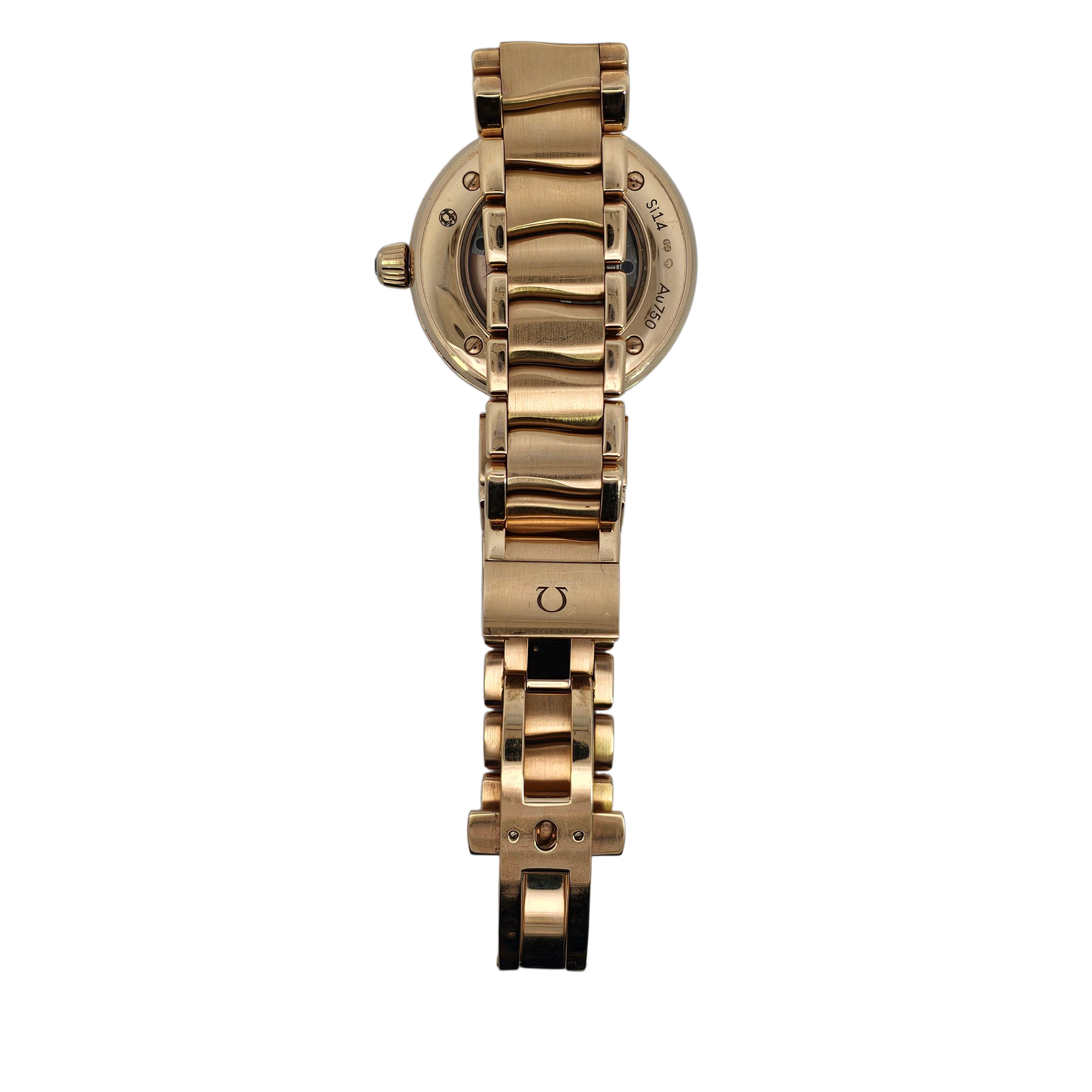The Omega De Ville Ladymatic 28mm is a dazzling expression of luxury and precision. Crafted in 18K rose gold with a mother of pearl dial, diamond hour markers, and a full diamond-set bezel and bracelet, this timepiece blends fine watchmaking with striking elegance.