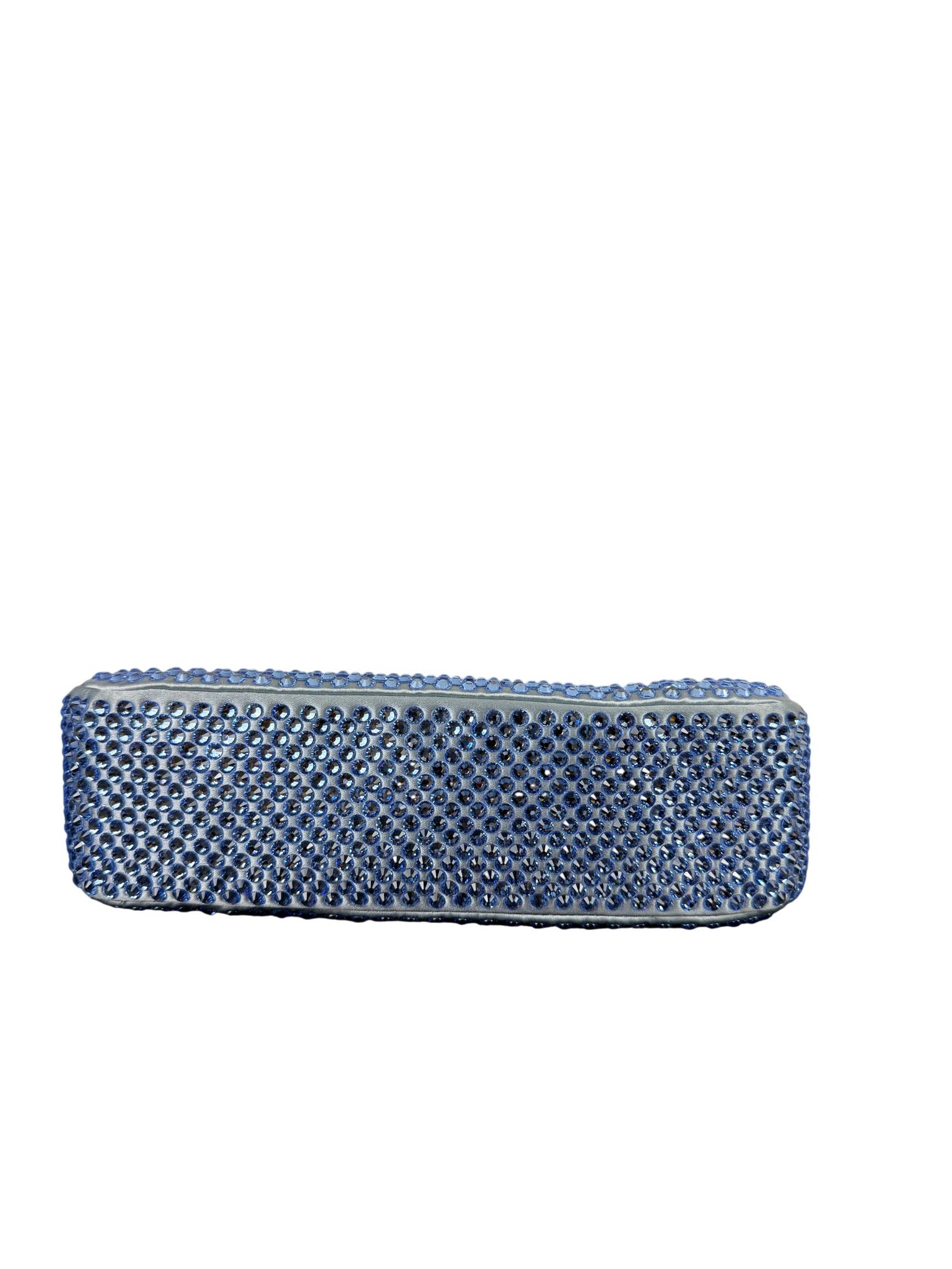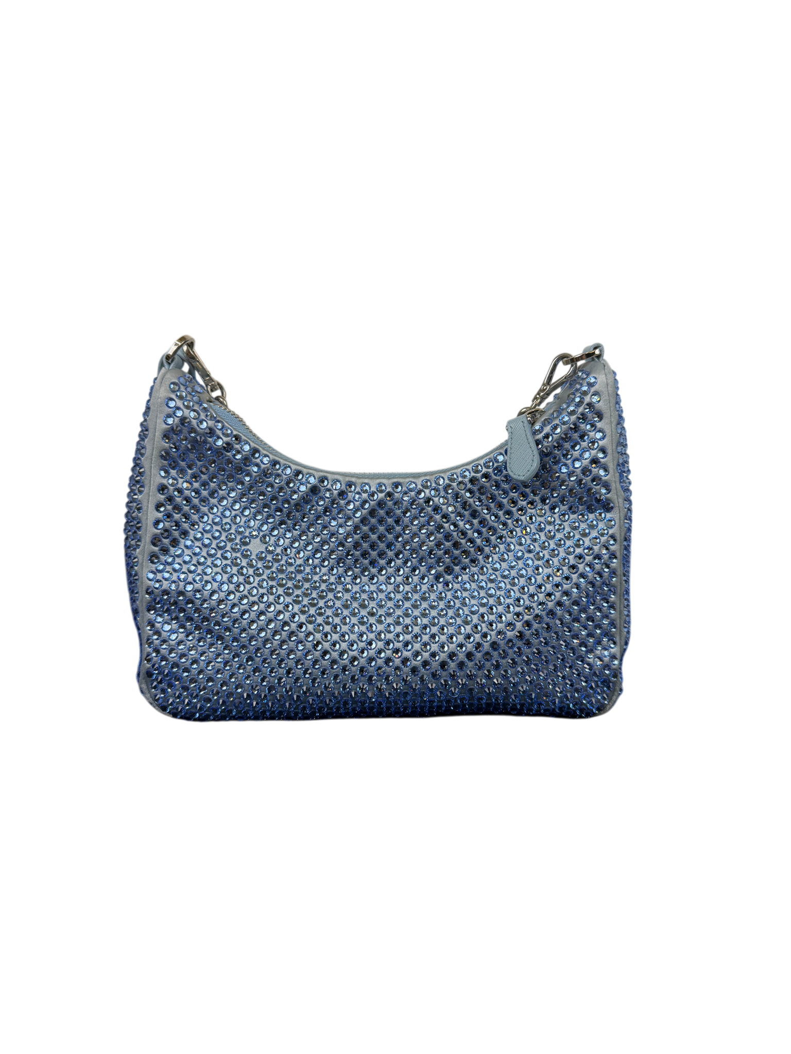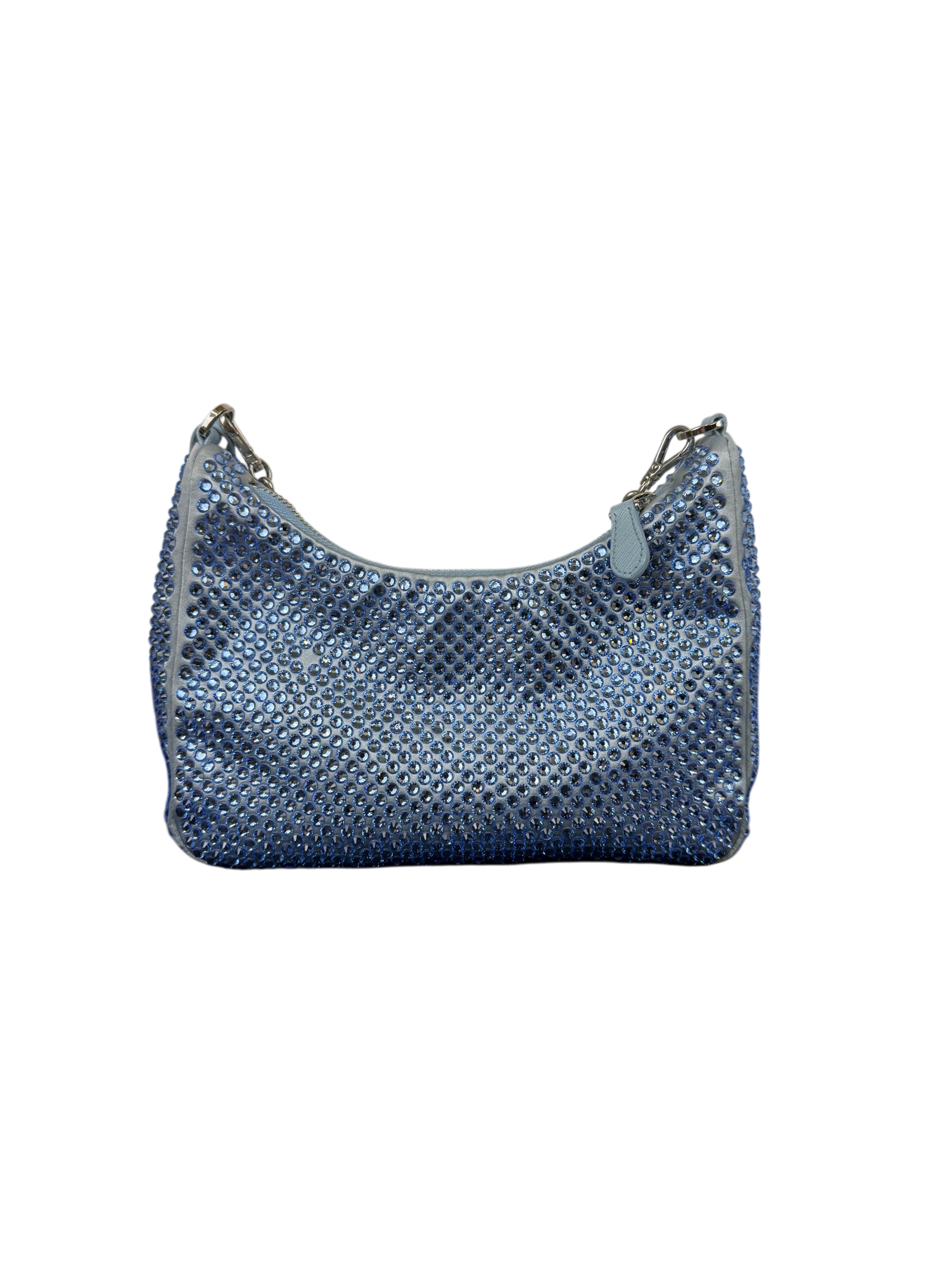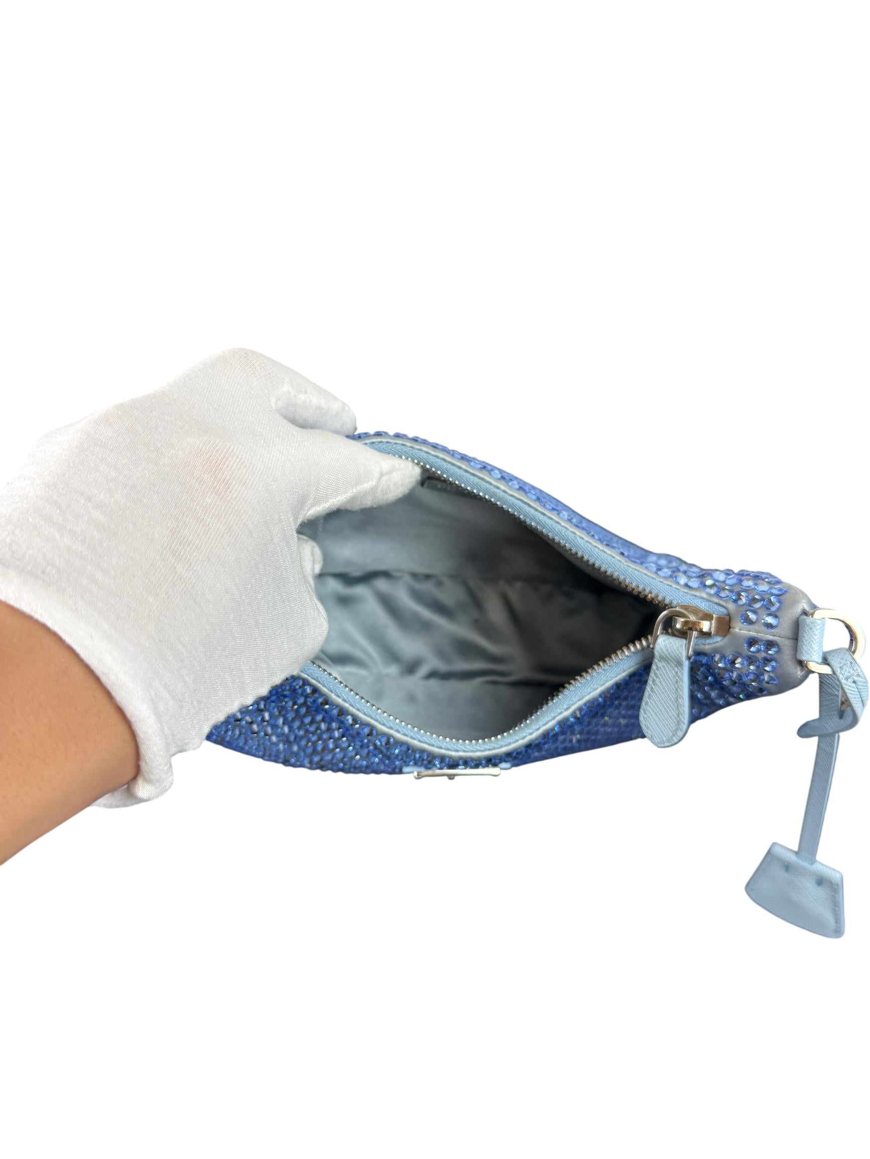 Prada Re-Edition 2000 Satin Crystal Mini Hobo Bag - Light Blue is a luxurious fashion accessory featuring a light blue satin exterior adorned with sparkling silver crystals. This elegant mini bag includes a zipper closure, a blue strap, and a sleek design perfect for stylish occasions. Ideal for adding a touch of sophistication, the bag combines iconic Prada craftsmanship with modern glamour.