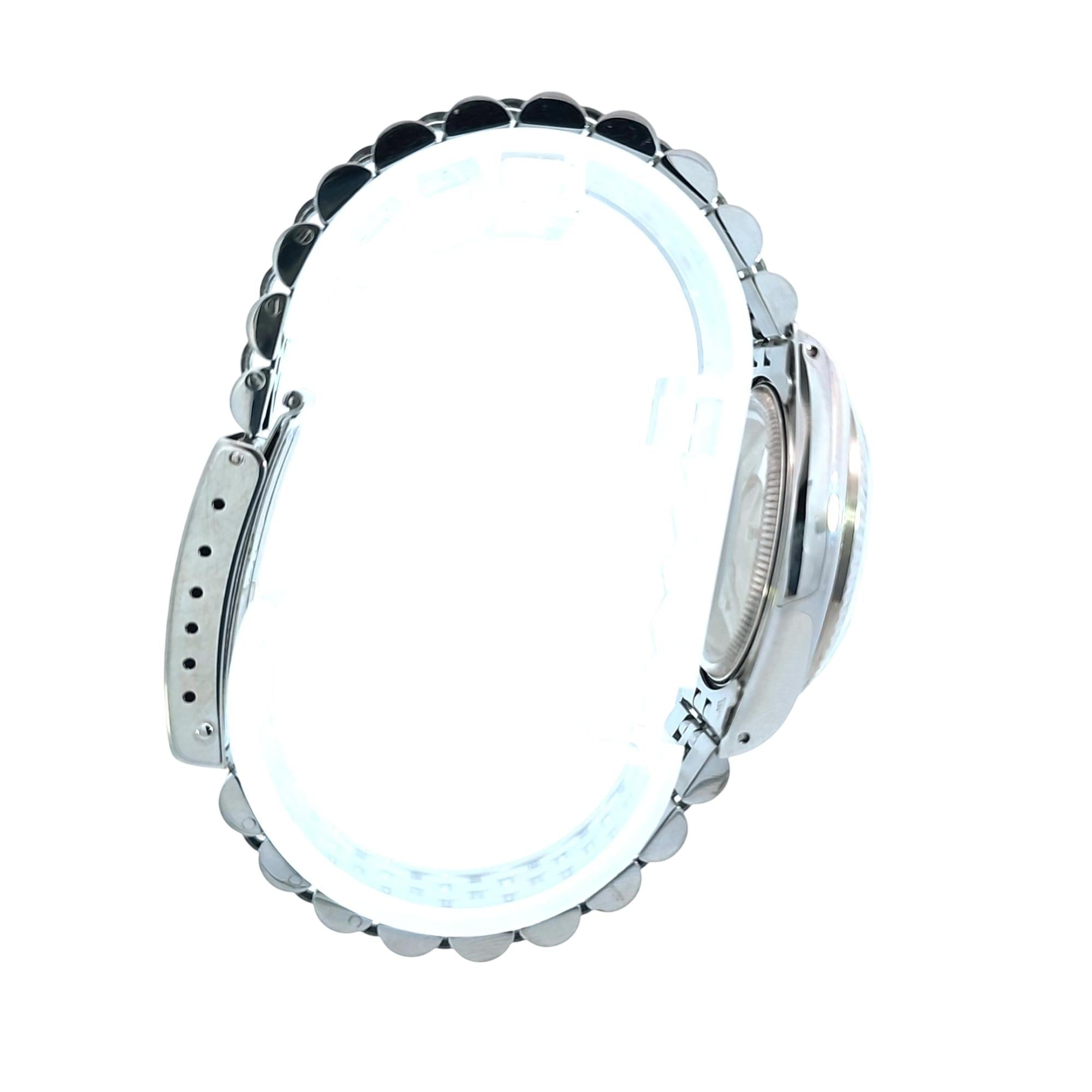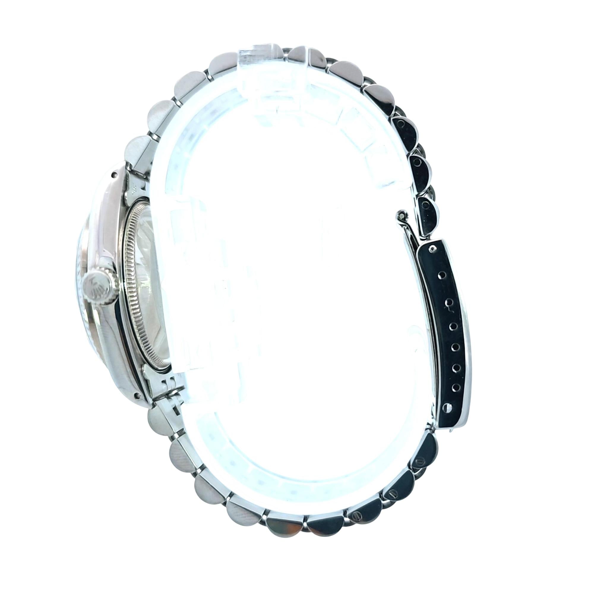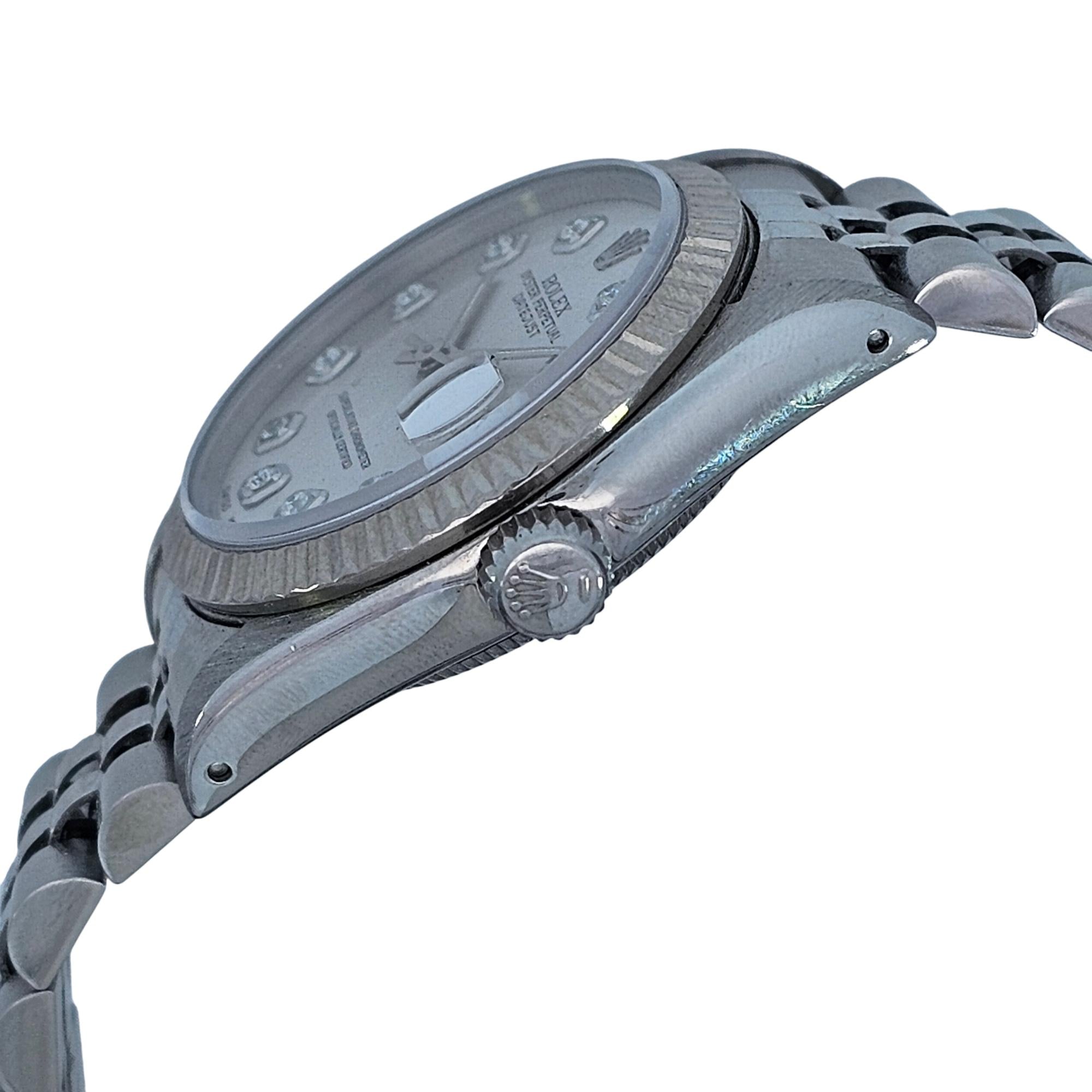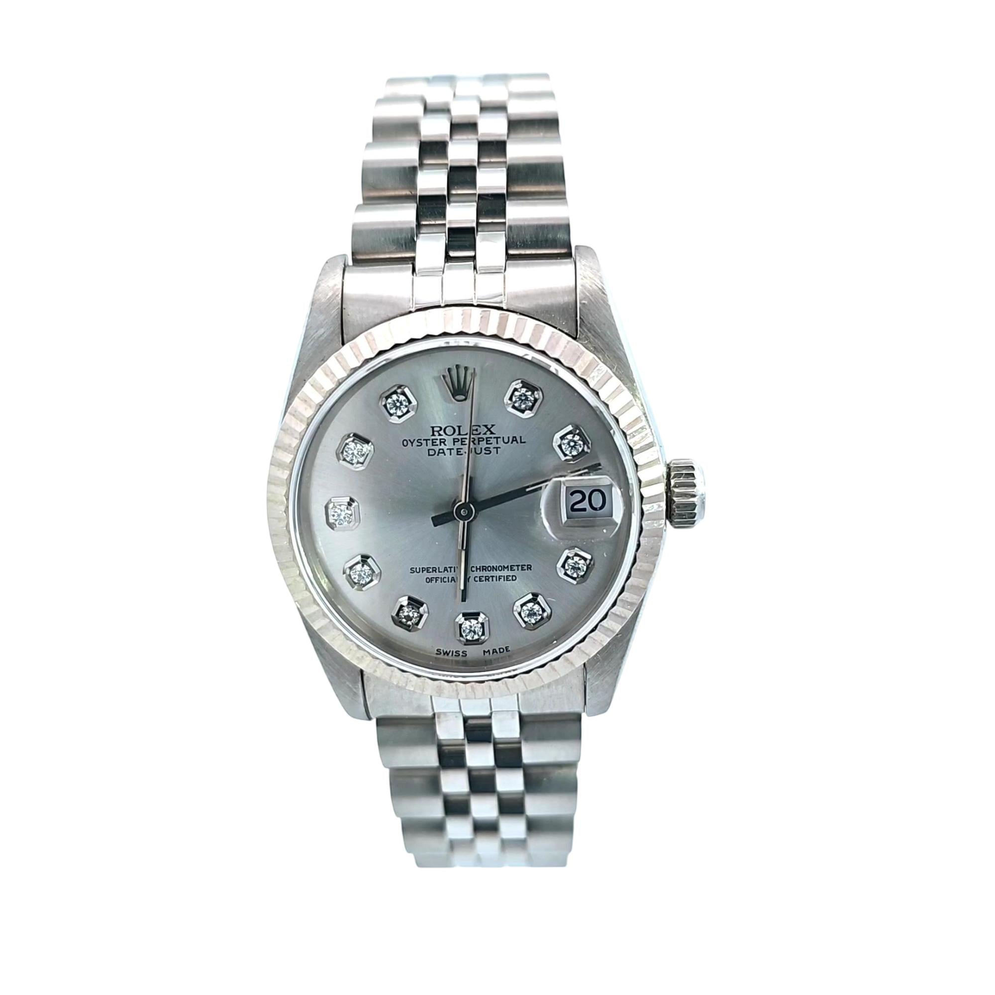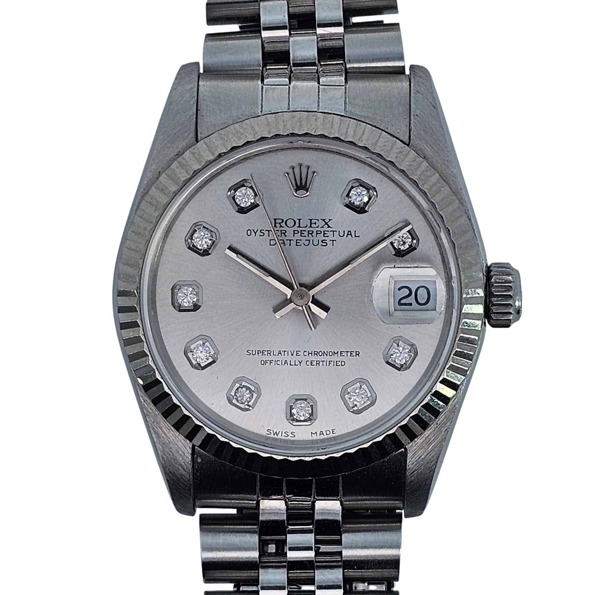 Experience timeless luxury with the Rolex Oyster Perpetual Datejust 31mm, featuring a stainless steel case and bracelet, 18K White gold fluted bezel, and distinctive after market silver dial with diamond hour markers. This Swiss-crafted, officially certified chronometer boasts automatic movement and an iconic, elegant design, making it perfect for both formal occasions and everyday sophistication. Invest in a watch that combines heritage, performance, and enduring value.