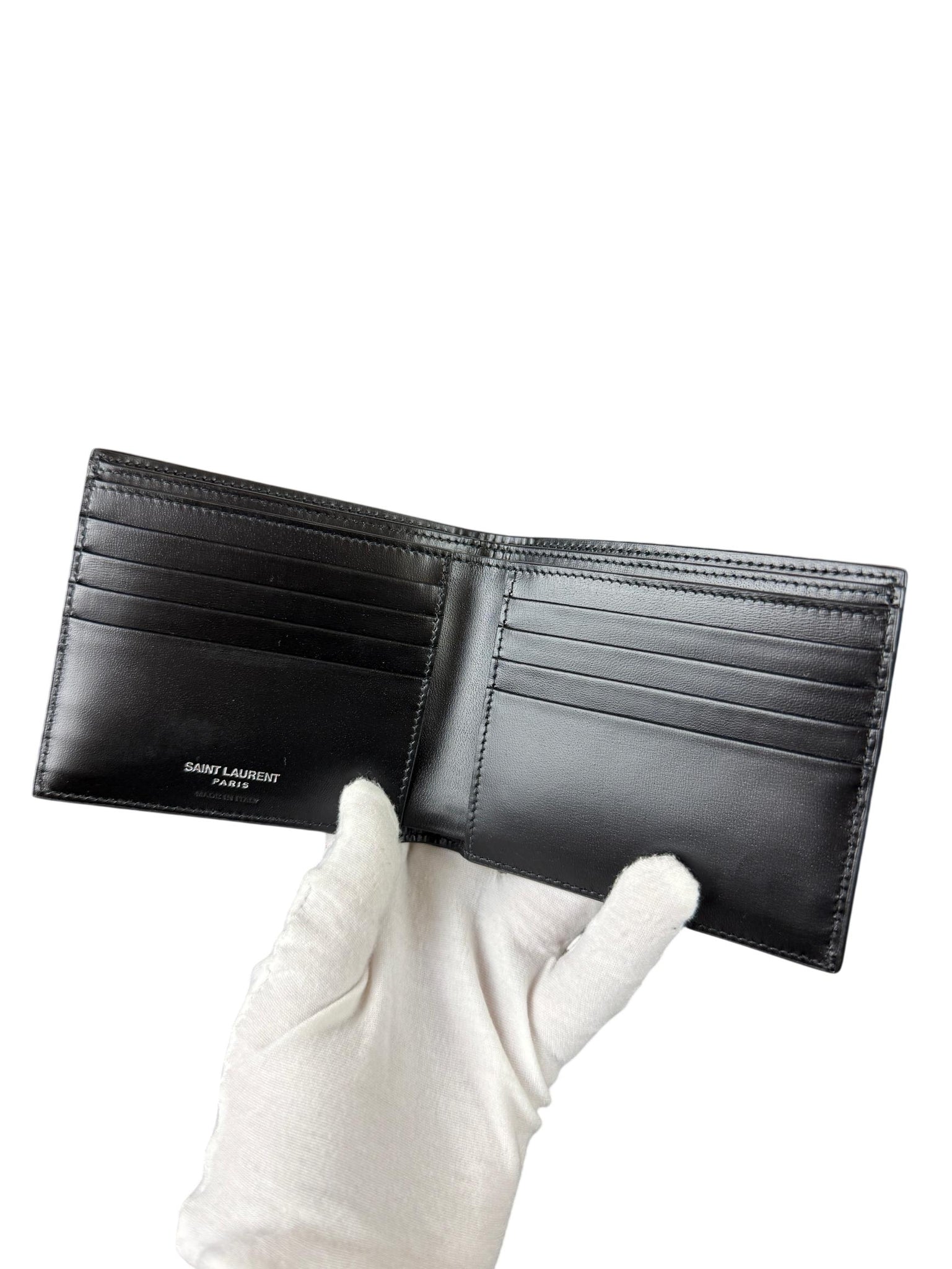 Saint Laurent Paris Tiny Cassandra Black Leather Bifold Wallet is a sleek and stylish accessory crafted from premium black leather with detailed stitching. This compact bifold wallet features the iconic Saint Laurent Paris logo, offering a sophisticated everyday carry solution for organizing cards and cash. Perfect for fashion-conscious individuals seeking luxury and practicality.