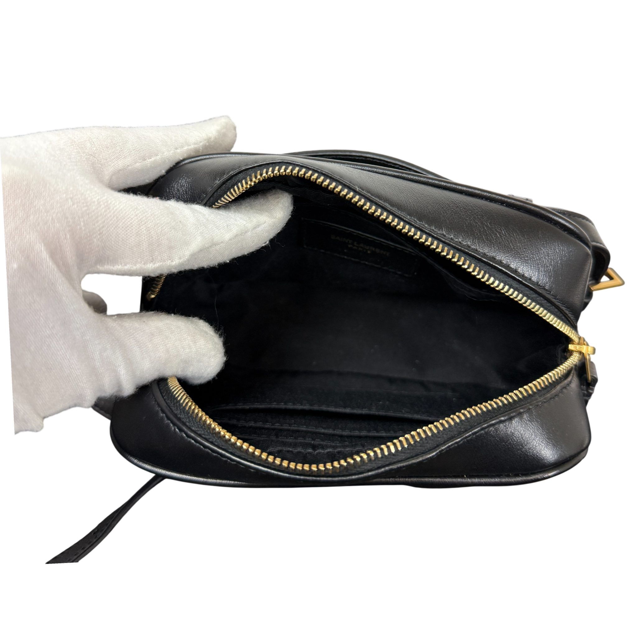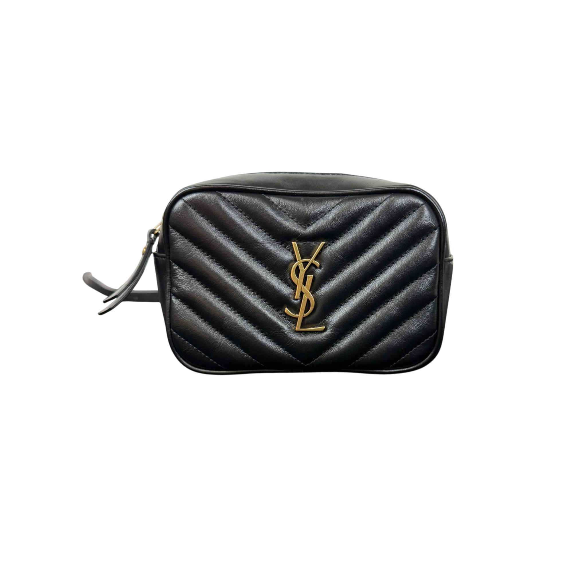 Yves Saint Laurent Lou Calfskin Leather Crossbody Belt Bag Black features premium black calfskin leather with gold-tone hardware, including a distinctive belt buckle and zipper details. This compact and stylish crossbody bag offers a sleek strap design perfect for hands-free convenience, making it an ideal accessory for luxury fashion lovers. Optimized for everyday use, it combines functionality with iconic Saint Laurent elegance.
